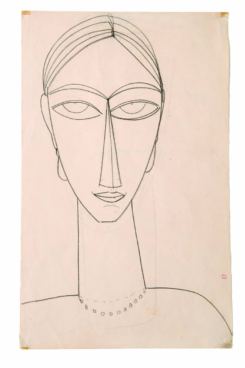 - NOTIZIE STORICO CRITICHE Il disegno fa parte della serie di opere donate nel 2017 al FAI da Clara Lavagetti, vedova di Guido Sforni, collezionista e conoscitore appassionato di arti figurative. L'opera presenta i tratti più riconoscibili di Modigliani, uno stile secco e geometrizzante che trasforma i volti in maschere che alludono alla scultura africana. Sono presenti tracce a matita leggera di disegni sottostanti in corrispondenza del collo e del mento.
