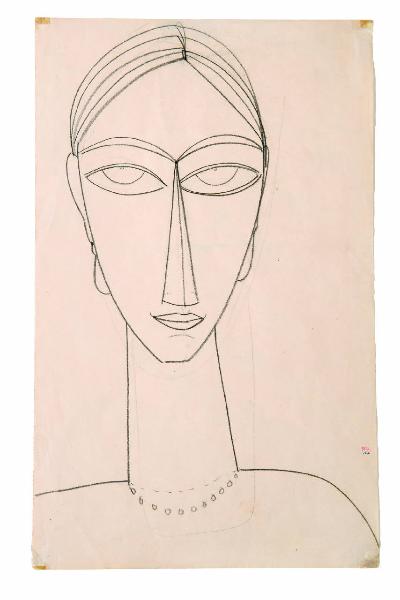 Disegno a matita su carta leggera, raffigurante un volto femminile visto frontalmente. Soggetto reso attraverso una linea essenziale molto schematica e geometrica.
