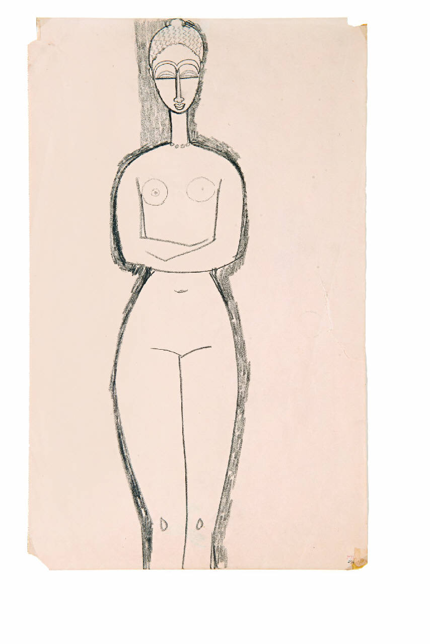 - NOTIZIE STORICO CRITICHE Il disegno, già nella collezione di Paul Alexandre, medico e mecenate di arte contemporanea, primo amico e sostenitore del giovane Modigliani, fa parte della serie di opere donate nel 2017 al FAI da Clara Lavagetti, vedova di Guido Sforni, collezionista e conoscitore appassionato di arti figurative. L'opera si inserisce tra i numerosi nudi che l'artista realizza durante tutto il corso della sua produzione. \nLa figura, in piedi, con le braccia incrociate, presenta i tipici tratti stilistici di Modigliani: occhi a mandorla, naso allungato, sopracciglia unite, caratterizzati da una linea insistita, che si ammorbidisce nelle rotondità del corpo della donna.