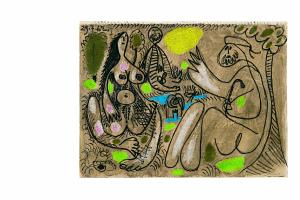- NOTIZIE STORICO CRITICHE Il disegno fa parte della serie di opere donate nel 2017 al FAI da Clara Lavagetti, vedova di Guido Sforni, collezionista e conoscitore appassionato di arti figurative. Tra il 1959 e il 1961 Picasso lavora a una serie di disegni e dipinti ispirati al dipinto "Le Déjeuner sur l'herbe" di Édouard Manet (1863). L'opera di Manet presenta in primo piano una figura femminile nuda seduta a conversare con due uomini completamente vestiti e una donna, una bagnante, nella parte di sfondo dell'opera. Questo foglio, datato e firmato sul recto, è una ripresa personale che l'artista sviluppa sul tema, tra i diversi disegni presenti in collezione certamente quello che si riferisce in maniera più diretta all'opera di Manet.