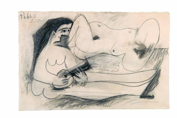 - NOTIZIE STORICO CRITICHE Il disegno fa parte della serie di opere donate nel 2017 al FAI da Clara Lavagetti, vedova di Guido Sforni, collezionista e conoscitore appassionato di arti figurative. Tra il 1959 e il 1961 Picasso lavora a una serie di disegni e dipinti ispirati al dipinto "Le Déjeuner sur l'herbe" di Édouard Manet (1863). L'opera di Manet presenta in primo piano una figura femminile nuda seduta a conversare con due uomini completamente vestiti e una donna, una bagnante, nella parte di sfondo dell'opera. Questo foglio, datato e firmato sul recto, è una ripresa personale che l'artista sviluppa sul tema del nudo femminile: due donne sono stese a riposo, quella in primo piano indossa solo un paio di scarpe col tacco ed è intenta a suonare un mandolino, quella dietro è resa con tratti meno accurati e quasi non presenta il volto.