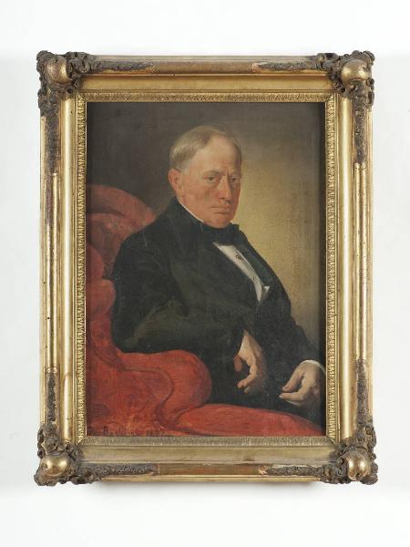 Dipinto entro cornice in legno intagliato e dorato.\nDal fondo in cui compare solo la poltrona rossa su cui poggia il personaggio raffigurato, emerge il ritratto maschile, leggermente di tre quarti. La luce proveniente da sinistra sottolinea i tratti fisionomici del volto. Si notano i passaggi graduali di chiaroscuro che suggeriscono la morbidezza delle carni. Il fondale neutro non distoglie l'attenzione dell'osservatore dal personaggio raffigurato.