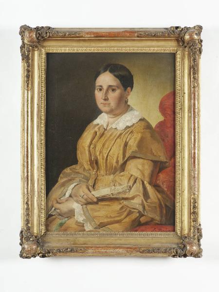 Dipinto entro cornice in legno intagliato e dorato.\nDal fondo in cui compare solo la poltrona rossa su cui poggia il personaggio raffigurato, emerge il ritratto femminile, leggermente di tre quarti. La luce proveniente da sinistra sottolinea i tratti fisionomici del volto e mette in risalto la preziosità, l'eleganza delle vesti. Si notano i passaggi graduali di chiaroscuro che suggeriscono la morbidezza delle carni. Il fondale neutro non distoglie l'attenzione dell'osservatore dal personaggio raffigurato.