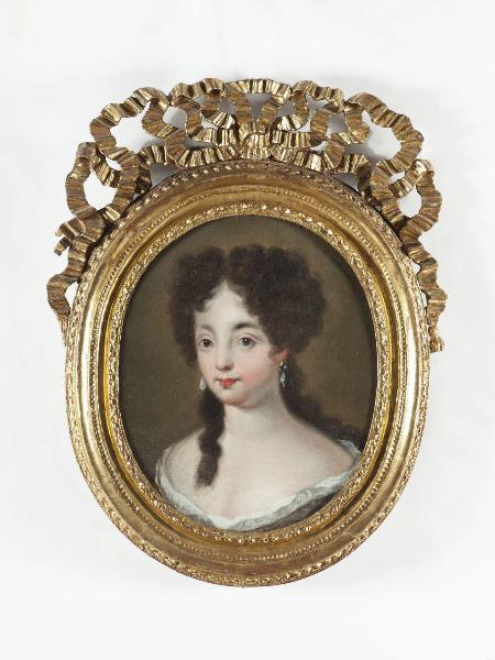 Dipinto di forma ovale inserito all'interno di una ricca cornice in legno dorato e intagliato con motivi decorativi geometrici, modulari e stilizzati; nella parte superiore, elegante e raffinato cartiglio in legno dorato e intagliato. Raffigura il ritratto di una dama dell'epoca, con elegante acconciatura dei capelli e raffinatezza delle vesti. Dal fondo scuro, privo di ogni elemento che potrebbe distogliere l'attenzione dell'osservatore dal personaggio raffigurato, emerge il ritratto femminile, leggermente di tre quarti. La luce proveniente da destra mette in risalto i tratti fisionomici del volto. Si notano i passaggi graduali di chiaroscuro e la ricerca interiore e psicologica del personaggio che occupa quasi per intero la superficie pittorica messa a disposizione.