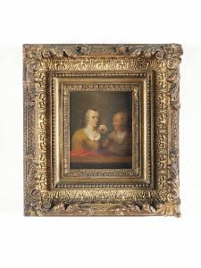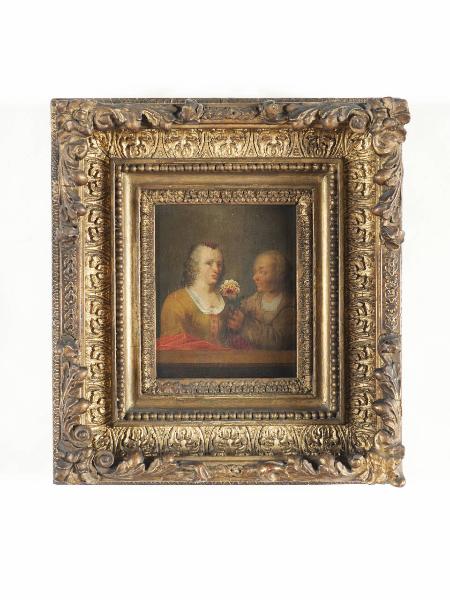 Dipinto entro una ricca cornice in legno intagliato e dorato.\nDue figure femminili che emergono da un fondo monocromo con tonalità scura. La luce proveniente da sinistra illumina i soggetti raffigurati uniti tra loro dal fiore centrale.