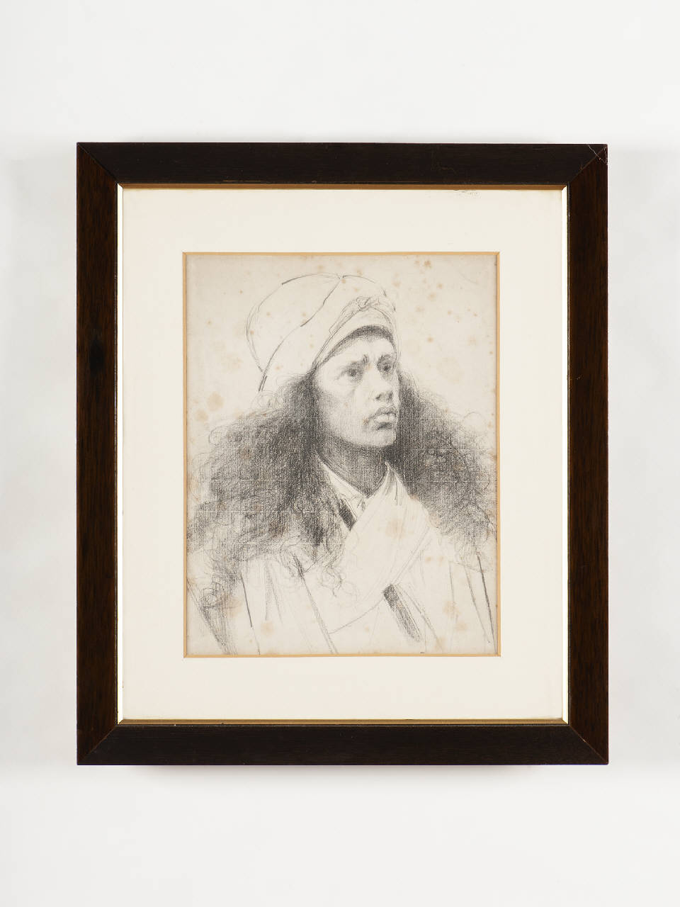 Disegno raffigurante un volto maschile visto leggermente di 3/4. La luce, proveniente da destra, mette in evidenza la vaporosità dei capelli e la morbidezza degli incarnati attraverso passaggi graduali di chiaroscuro.\nDisegno entro una semplice cornice in legno con profilatura interna modanata e dorata.