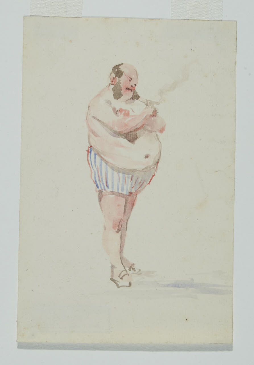 - NOTIZIE STORICO CRITICHE Comanducci, nel descrivere la figura di Giacomo Campi, ricorda: «Acquistò buona fama come decoratore e come creatore di tipi e di macchiette dei vecchi tempi [...]» (A.M. Comanducci, I pittori italiani dell'Ottocento. Dizionario critico e documentario, Milano 1934, p. 103). Nel disegno in questione si nota come il pittore tratteggi con ironia la figura di un "tipo" di uomo panciuto e borghese, che ci aspetteremmo di vedere vestito di tutto punto con gilet e cravattino ma che qui viene spogliato di ogni orpello. La figura è schizzata con gusto caricaturale: il pittore indugia in maniera quasi divertita nel delineare il grosso ventre scoperto dell’uomo che, impettito e noncurante della sua nudità, fuma un sigaro. Le grosse basette, unico elemento caratterizzante oltre al vistoso costume da bagno a strisce, denotano il gusto e la moda dell’epoca. Il disegno fa parte del lascito del pittore Vittore Grubicy de Dragon, avvenuto nel marzo del 1920.