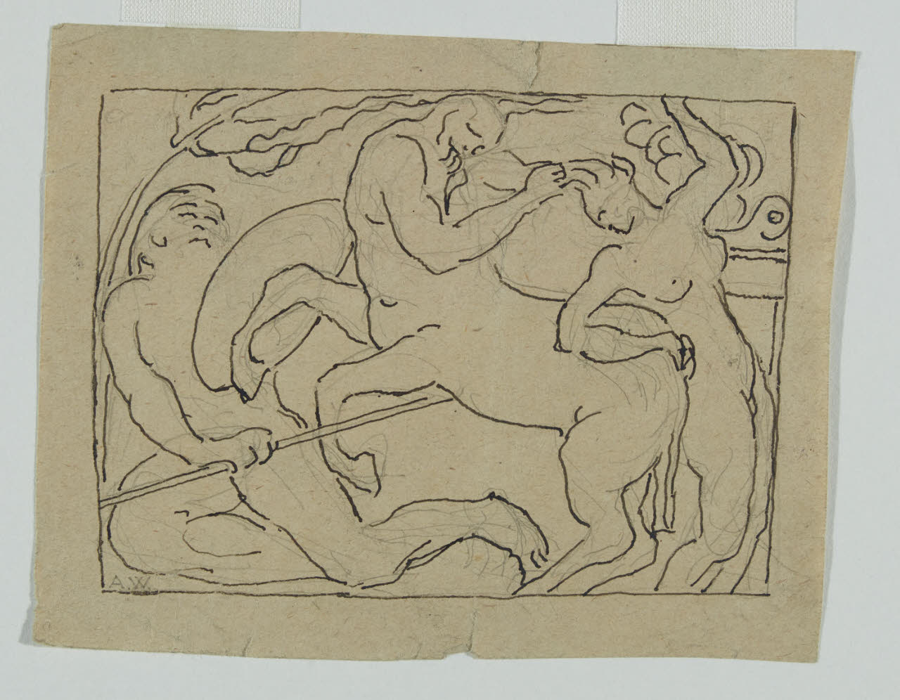 - NOTIZIE STORICO CRITICHE Il piccolo disegno inedito, eseguito con un sottile tratto di inchiostro nero, fu donato alle raccolte pubbliche milanesi nel 1960 da Giuseppe Balconi. Esso risulta riquadrato da una forma rettangolare che circonda la composizione nella quale è sommariamente raffigurata una centauromachia con tre figure intente a combattere.