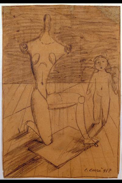 - NOTIZIE STORICO CRITICHE La ricerca Metafisica di Carrà, frutto di una sentita crisi di coscienza e d'inquietudine esistenziale è, se pur in parte, dovuta alla vicinanza del pittore con De Chirico, Savinio e De Pisis, incontrati a Ferrara nel 1917. La frequentazione con quest'ultimi segna nell'opera dell'artista una svolta decisiva che ne decreterà definitivamente l'allontanamento dal Futurismo per dare il via a un personale percorso metafisico. Nelle opere di questo momento, infatti, Carrà si dedica principalmente alla raffigurazione di interni e stanze vuote, nelle quali capeggiano figure spettrali, oggetti isolati o stipati a scandire lo spazio, strutture anatomiche che rimandano di continuo a forme geometriche solide (Carrà 1996, p. 50). \nTra i disegni del periodo oltre al piccolo "Manichino nella stanza IV" (inv. 178) si conserva presso le raccolte del Civico Gabinetto di Disegni del Castello Sforzesco, il foglio intitolato "Manichino con angelo", acquistato come il precedente nel 1953 direttamente dall'artista (Garberi 1991). In esso su un taccuino da schizzi, tratteggiato da linee parallele che delimitano lo spazio del pavimento, Carrà esegue due figure attraverso un delicato tratto della matita che sfuma i contorni e ne crea le ombre. Qui il manichino sembra non obbedire alla staticità che lo contraddistingue in altre opere e assume invece una posa elegante e aggraziata che lo contrappone a sua volta alla figura dell'angelo più statica e abbozzata.