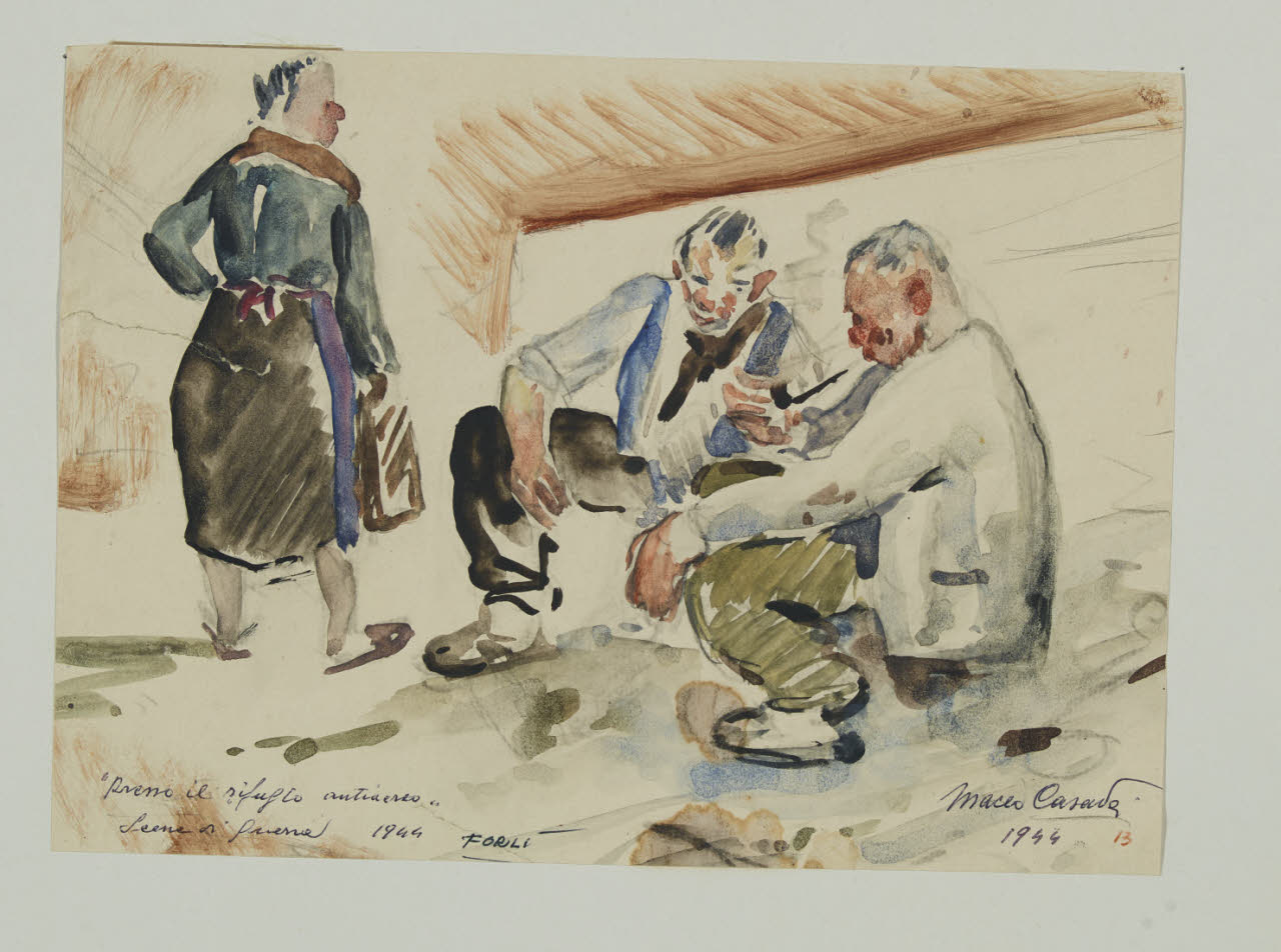 - NOTIZIE STORICO CRITICHE All'interno delle raccolte di grafica del Gabinetto di Disegni del Castello Sforzesco si conserva di Maceo Casadei un vasto numero di opere realizzate durante la Prima e la Seconda Guerra Mondiale. Nel 1942 erano stati acquistati dalla Galleria Il Milione, quindici fogli di guerra (invv. 1949/1 C202/1 - 1949/15 C 202/15) esposti nella galleria milanese alla fine dello stesso anno. Un altro nucleo di sedici disegni fu invece donato dall'artista alle raccolte pubbliche intorno agli inizi degli anni Sessanta del Novecento (invv. Agg. 68-71; Agg. 228-238). \nDi queste ultime opere fa parte il foglio appartenente al gruppo delle 'scene di guerra', raffigurante tre figure all'interno di un rifugio antiaereo, due di queste intente a conversare. Tracciati leggermente a matita, i personaggi sono ricoperti da grossolane pennellate di acquerello. \nIl disegno, datato al 1944, è probabile che sia stato pubblicato all'interno di qualche periodico con cui l'artista forlivese collaborava saltuariamente in quegli anni. La sua produzione relativa agli eventi di guerra non si limitò agli anni 1940-1943, ma si protrasse anche dopo, interessando in particolare la zona di Cassino e Montecassino, teatro di terribili bombardamenti nel 1945.