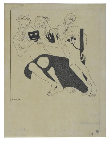 - NOTIZIE STORICO CRITICHE Le opere grafiche di Wildt svolgono un ruolo fondamentale nella produzione dell'artista al punto da poter essere considerate, nella maggior parte dei casi, operazioni autonome parallele alle opere di scultura. In esse Wildt mostra un graffitismo di matrice secessionista che abbandona l'eleganza decorativa in favore di accenti espressionisti. Il disegno a inchiostro di china, conservato presso il Gabinetto di Disegni del Castello Sforzesco, è una delle prime bozze create per la composizione utilizzata da Vittorio Pica, suo grande stimatore, nel frontespizio del saggio I disegni di tre scultori moderni: V. Gemito, C. Meunier, A. Rodin pubblicato nella rubrica "Attraverso gli albi e le cartelle" intorno alla seconda metà degli anni Dieci. Lo stesso soggetto infatti è riprodotto in un altro esemplare, conservato in collezione privata, che riprende la stessa composizione del disegno del Castello, differenziandosi da esso semplicemente per l'aggiunta dei nomi identificativi sopra i personaggi e la scritta in basso alla composizione: DISEGNI DI TRE SCVLTORI MODERNI (GEMITO - MEVNIER - RODIN). Quest'ultimo foglio datato da Paola Mola al 1916 (P. Mola, Adolfo Wildt: 1868-1931, Milano 1989, pp. 111, 179 n. 63; lo stesso foglio è pubblicato in "Wildt. L'anima e le forme" e "Adolfo Wildt, L'ultimo Simbolista") testimonia l'impegno di Wildt nel creare diverse impaginazioni per questo progetto ideativo. Le tre figure, assumono qui eleganti pose anticlassiche e trattengono tra le mani rispettivamente una maschera, la fiamma e un tronco fiorito, simboli della propria virtù ma allo stesso tempo allegorie delle forze e delle insidie del lavoro dello scultore (Dallaj 1991). Così come molte delle opere grafiche dell'artista che caratterizzeranno questo periodo, nel disegno in questione il chiaroscuro è abbandonato in favore di tinte monocrome e linee sottili che determinano una bidimensionalità accentuata dalla sintesi compositiva dei tre personaggi. Dalla lettura del registro di carico, si apprende che il disegno fu venduto, insieme ad altre opere grafiche, dalla Signora Anna Marazzani, vedova Pica, tramite la Galleria Casa d'Artisti, alle raccolte pubbliche milanesi e che tali fogli costituivano "la rimanenza della raccolta di Vittorio Pica, già messa all'asta dall'antiquariato Toscanini e probabilmente ridotta ancora attraverso vendite private."