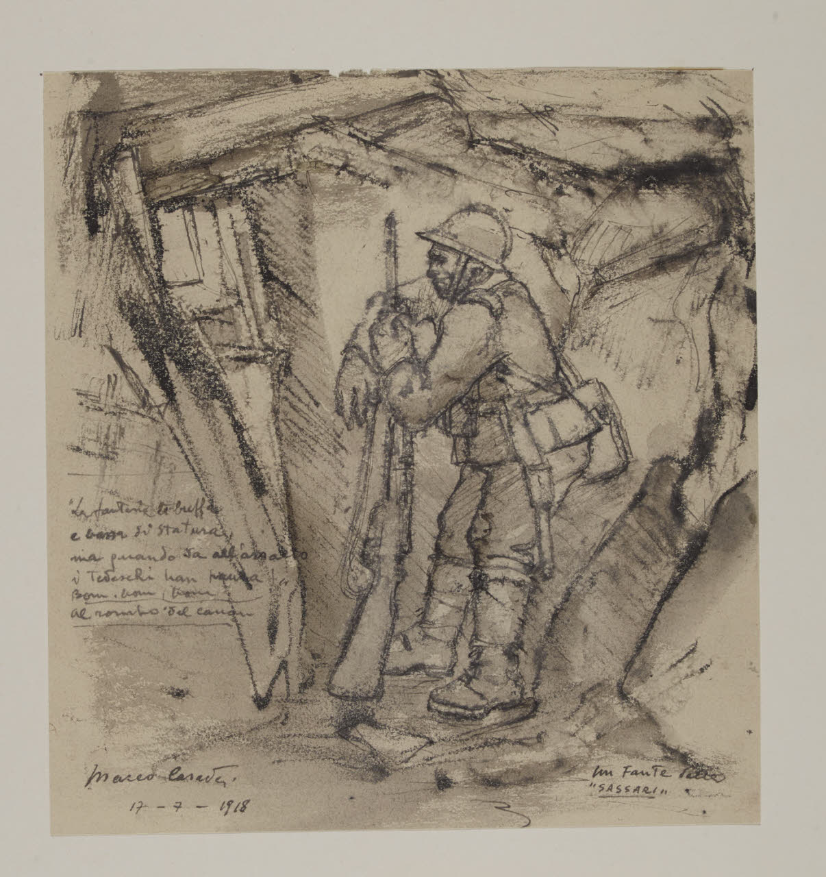 - NOTIZIE STORICO CRITICHE Maceo Casadei si colloca all'interno delle diverse correnti artistiche del Novecento come una figura indipendente nel vasto panorama culturale del XX secolo. Il pittore forlivese dopo una prima formazione di stampo postimpressionista a Lione nel 1917 è costretto a tornare in Italia per combattere la Grande Guerra. In quell'anno viene arruolato come mitragliere reggimentale alla 211a Compagnia che guerreggiava in Trentino e dove tra i monti e le trincee non smise di dipingere e disegnare. "Pur nella condizioni di profonda solitudine morale, il giovane artista avrebbe saputo affrontare quella situazione di grave disaggio conservando un proprio equilibrio e le libertà di fantasia. Anzi, essa non costituì un limite ma divenne pretesto per una non esamine interpretazione di temi ingrati e amari" (G. Viroli, Maceo Casadei. Catalogo generale - I, Forlì 1998, p. 9). \nAll'interno delle raccolte del Gabinetto di Disegni del Castello Sforzesco si conservano del pittore forlivese un vasto numero di opere realizzate durante la Prima e la Seconda Guerra Mondiale. Datati al 1918 sono alcuni disegni (Invv. Agg. 69; 71; 230; 231; 233; 235, 236; 237; 238), donati dall'artista alle raccolte pubbliche nel 1964, insieme a un nucleo di altri sette disegni (invv. Agg. 239; 70; 228; 229; 234; 232; 68), eseguiti negli anni Quaranta, quando lavorava come fotografo e pittore documentarista per il "reparto guerra" dell'Istituto Nazionale Luce. La donazione di tali opere incrementò la raccolta di Maceo Casadei all'interno delle raccolte di grafica del Castello Sforzesco; nel 1942 infatti erano stati acquistati dal comune presso la Galleria Il Milione quindici fogli di guerra (invv. 1949/1 C202/1 - 1949/15 C 202/15) esposti dalla galleria milanese alla fine del 1942.\nI disegni eseguiti nel 1918 tra le Alpi del Veneto e del Trentino descrivono paesaggi rocciosi e montagne; in alcuni di essi capeggiano diverse case e baraccamenti o figure di bersaglieri. I disegni, realizzati attraverso veloci tratti di carboncino, matita o inchiostro nero sono caratterizzati da acquerellature di tonalità marroni e grigiastre che si contrappongono all'azzurro del cielo, attraverso variazioni cromatiche di grande intensità espressiva.\nIl foglio in questione, invece, si distacca dalle opere eseguite da Maceo nel corso della Prima Guerra Mondiale per il differente modo di concepire la composizione e per la diversa tecnica utilizzata. A differenza degli altri disegni realizzati nel 1918, al centro del foglio all'interno di un rudimentale casotto è rappresentato un fante che abbraccia il proprio fucile. La linea d'inchiostro che crea l'immagine è tremolante e incerta e risulta sfumata dall'acquerellatura sovrastante che ne attenua l'intensità. Tratti di matita nera, inoltre, contornano il perimetro della figura e della baracca, anch'essa cosparsa da pennellate acquose che ne sfumano i contorni. L'intero foglio è tinteggiato da un inchiostro nero diluito che associato al tratto nero della matita crea un gioco di luci e ombre di grande espressività.