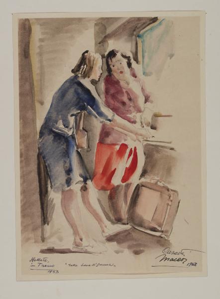 - NOTIZIE STORICO CRITICHE All'interno delle raccolte del Gabinetto di Disegni del Castello Sforzesco si conserva di Maceo Casadei un vasto numero di opere realizzate durante il primo e il secondo conflitto mondiale. Nel 1942 erano stati acquistati dal comune, presso la Galleria Il Milione, quindici fogli di guerra del pittore forlivese (invv. 1949/1 C202/1 - 1949/15 C 202/15) esposti nella galleria milanese alla fine dello stesso anno. Un altro nucleo di sedici disegni fu invece donato alle raccolte pubbliche dall'artista, agli inizi degli anni Sessanta del Novecento (Invv. Agg. 68-71; Agg. 228-238). \nDi questi ultimi fa parte il foglio inedito appartenete al gruppo delle 'scene di guerra' raffigurante due giovani donne su un vagone ferroviario che conversano dinanzi a un finestrino sulla carrozza di un treno. Così come documentato dall'autore nella scritta autografa in basso al foglio, si tratta di due donne sfollate in viaggio. Queste ultime, tracciate brevemente con leggeri tratti di matita, sono descritte da fluide pennellate di colori acquerellati. I loro volti impietositi sembrano mostrate la propria disperazione per i disastri prodotti dal conflitto e per l'incertezza del proprio destino.