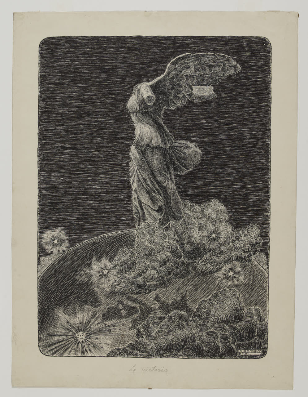 - NOTIZIE STORICO CRITICHE L’artista raffigura la "Vittoria di Samotracia" che, tra lampi ed esplosioni, sorvola il globo sopra l’Europa; si potrebbe forse pensare a un’allusione ai recenti scontri avvenuti in seguito alla Prima Guerra Mondiale. Il disegno, infatti, per confronti stilistici, può essere datato intorno al 1921. Uno spunto di confronto iconografico si potrebbe identificare con la "Nemesi o Grande Fortuna" di Dürer. Anch’essa alata, ma piuttosto pesante e possente, è posta su globo e fluttua al di sopra delle nuvole. Forse una suggestione simbolica tra la dea della Vittoria e quella ibrida tra Fortuna e Giustizia, così come è identificata la "Nemesi" düreriana, potrebbe aver ispirato l’autore. Il disegno, dal sapore simbolista e Decò, è molto lontano dalla produzione pittorica astratta dell’artista. Juan Bay, argentino di nascita, durante gli anni Dieci si avvicina ai Futuristi mentre, in seguito, sceglierà la strada dell’arte astratta e non figurativa. Il tramite con la stagione italiana simbolista potrebbe esser individuato nei due maestri di Bay presso l’Accademia di Brera: Giuseppe Mentessi e Mario Ornati, rispettivamente legati a Gaetano Previati e a Giulio Aristide Sartorio.