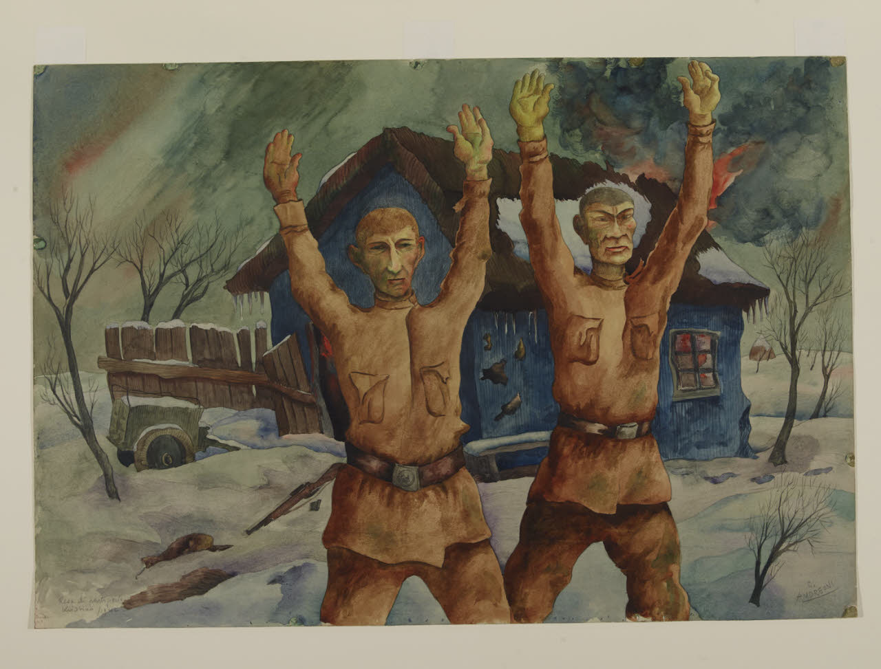 - NOTIZIE STORICO CRITICHE Nel 1941, su incarico dell’Ufficio Propaganda, Cesare Andreoni lascia Milano e prende parte prima in Croazia e, successivamente, in Russia alla campagna bellica come corrispondente di guerra. Datato al 1942, così come indicato dall’annotazione manoscritta, è l’acquerello "Resa di partigiani", opera eseguita dal pittore a Krissino. Il disegno, in bilico tra spontaneità e maniera, ha uno stile e una qualità espressiva che risulta diacronica rispetto alla precente produzione milanese. Nonostante ciò, nel foglio sembra affiorare il ricordo delle opere di Aligi Sassu, un lirismo chiaro e lampante e una linea pittorica bonaria dal sapore bruegheliano. Due partigiani sono descritti attraverso una rigorosa selezione dei gesti, con schietta e spontanea semplicità realistica. I due protagonisti, con occhi profondi e vigili, vengono rappresentati con minuziosi particolari espressivi e sembrano dominati da un’istintiva rassegnazione, come gli attori di un dramma momentaneo. Andreoni, tornato nel capoluogo lombardo nel 1943, porta con sè una sterminata quantità di disegni, schizzi e acquerelli. Queste opere documentano con intelligente umanità i luoghi attraversati, le vicende delle truppe al fronte e quelle delle popolazioni locali.