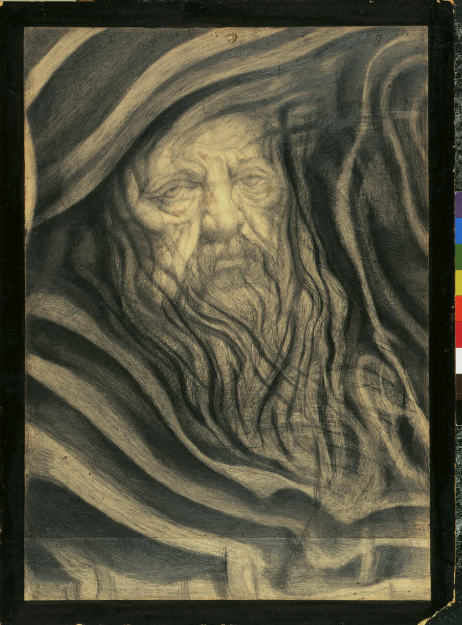 - NOTIZIE STORICO CRITICHE Il disegno, omaggio a Vittore Grubicy, artista, mercante e figura chiave nella promozione culturale del capoluogo lombardo, è datato 1905, anno in cui era presente alla Biennale di Venezia insieme a "Il Sospetto! e a "Il Rancore". Fu Gubricy, infatti, a scoprire il talento di Romani che nel 1902 si era trasferito a Milano, e a presentarlo l'anno successivo all'Esposizione Internazionale della caricatura di Varese, dove l'artista espose nove opere grafiche apprezzate dalla critica. Nel disegno, l'uomo cinquantaquattrenne è raffigurato come un saggio profeta, un filosofo dagli occhi ipnotici e dallo sguardo disincantato. Nella rappresentazione del volto, frutto di una ricca analisi fisiognomica, l'artista esprime, attraverso linee sottili, la vecchiaia della figura e l'ampiezza del suo vissuto, con una tecnica che rimanda ai lavori dei maestri del passato, come le caricature di Leonardo o le opere grafiche di Dürer, ma che risente allo stesso tempo dell'influsso delle opere moderne, quali le litografie di Munch, che l'artista bresciano poté osservare su "Emporium" nel 1904 o le opere di Previati, da cui Romani fu influenzato. Il risultato è una struttura dalla forte energia psicologica, in cui la finissima tessitura dei tratti che si declina in infinite sfumature di bianco e nero, invade lo spazio compositivo con forte incisività, e le zone d'ombra esaltano la plasticità del viso (Quinsac 2005). Il disegno, come riportato da Comino, fu riprodotto in "Cronache d'Oro. Rivista Mensile illustrata internazionale" nel 1912 e nel 1914 (Comino 2009).