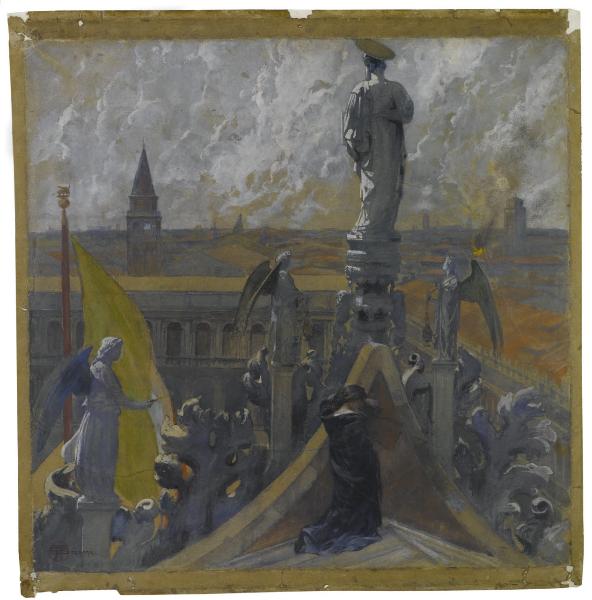 - NOTIZIE STORICO CRITICHE Pittore, decoratore, illustratore, incisore e architetto, Augusto Sezanne sceglieva spesso, come soggetto delle proprie opere, ritratti, paesaggi naturalistici, scene di vita, figure di animali e decorazioni floreali realizzati in stile Liberty. Con i suoi lavori, partecipò alle maggiori esposizioni nazionali e internazionali e collaborò con diverse riviste illustrate italiane. Si occupò, inoltre, della serie degli otto manifesti che annunciarono l'apertura della Biennale di Venezia negli anni in cui la manifestazione fu affidata prima ad Antonio Fradeletto e poi a Vittorio Pica. Benché l'architettura e la decorazione murale occupassero gran parte della sua attività, l'artista non trascurò la pittura da cavalletto a olio e a tempera, realizzando dipinti di vario genere e scorci dell'adorata Venezia. In essi, l'artista ha voluto raccontare sia i momenti migliori della città che quelli più bui e tristi, come i tragici avvenimenti della Grande Guerra. La tempera su carta intitolata "Mattino dopo l'incursione aerea a Venezia", conservata presso le raccolte del Gabinetto di Disegni del Castello Sforzesco, ne è un esempio; essa infatti raffigura una veduta della Serenissima il mattino dopo i bombardamenti aerei delle forze austriache. Il foglio mostra la città incendiata e fumante vista dall'alto di un palazzo, e in primo piano una giovane donna inginocchiata sulla sommità di un edificio mentre si dispera per il disastro che le bombe hanno causato. Precedentemente intelaiata e dotata di una cornice dorata, sul controfondo del disegno (staccato nel corso di un intervento di restauro), si leggeva la scritta "Augusto Sezanne. R. Istituto Belle Arti Venezia - Venezia 1916 - "Un mattino dopo una incursione aerea". Fu acquistato nel 1917 durante la mostra "Esposizione delle tre Venezie" presso la Galleria Pesaro, un'esposizione di artisti provenienti o legati alla città lagunare per ragioni artistiche o di storia. Così come recita il catalogo dell'esposizione, la mostra fu ospitata a Milano a causa delle "ardue condizioni create dalla guerra alla Città di S. Marco", le quali impedirono "di accogliere questa Esposizione, che sarebbe idealmente sua. Venezia dopo aver ospitato per un ventennio l'arte di tutto il mondo, deve chiedere ospitalità per gli artisti che più le appartengono" (cfr. Esposizione delle tre Venezie, 1917).