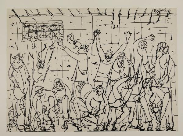 - NOTIZIE STORICO CRITICHE Agostino Barbieri intraprende l’attività artistica sin da giovanissimo. La chiamata alle armi, nel corso della Seconda Guerra Mondiale, lo porta in Jugoslavia come combattente nella campagna di Russia e dal 1943 è impegnato nella guerra di liberazione partigiana. Nel novembre del 1944, viene arrestato e deportato come prigioniero politico in un piccolo paese a pochi chilometri da Linz, nel campo di concentramento di Mauthausen. La tragica realtà a Mauthausen, oltre a lasciare un’impronta indelebile all’interno della sua esistenza, ha portato l’artista a creare alcune tra le più struggenti testimonianze grafiche sui campi di sterminio nazisti. All’interno delle raccolte del Civico Gabinetto di Disegni del Castello Sforzesco di Milano si conservano quindici disegni realizzati da Barbieri nel 1945, probabilmente subito dopo il suo ritorno in Italia (inv-inv. agg. 549-563). \nQueste opere sono caratterizzate da una forte concitazione espressiva mediata da una drastica semplificazione grafica della linea. Corpi nudi e senza vita sono ammassati su comuli di cadaveri, figure larvali dai volti smarriti sono posti all’interno di forni crematoi o in squallide baracche, lavorano nelle cave o all’interno del campo. In queste opere, il vigore della linea riesce a esprime e a comunicare aspetti di una realtà angosciante, un mondo dove ogni speranza è perduta e dove la sola certezza è la morte. Per l’incisività del tratto di china e la prorompente forza espressiva, tali opere possono considerarsi come una delle più toccanti testimonianze dell’agire umano; esse sono il ripensamento intellettuale di un ricordo indelebile, sono la denuncia alla più mostruosa macchina di annientamento verso l’essere umano. Forte è inoltre il legame tra questi disegni e le opere dell’espressionismo tedesco, dove la presenza di figure spettrali diventa l’elemento principale di una pantomima sociale: nei disegni di Barbieri, però, tali elementi diventano fantasmi ridotti al degrado più assoluto, sono corpi che simulano l’esistenza attraverso una terribile danza macabra