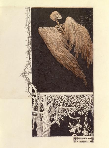 - NOTIZIE STORICO CRITICHE Come ricordato da Mercedes Garberi fu grazie alla segnalazione di Emilio Bertonati che, nel 1981, le collezioni civiche del Castello Sforzesco ottennero, grazie a un acquisto presso la Galleria del Levante, i quattordici disegni a inchiostro di china e acquerello eseguiti da Alberto Martini intorno 1895, raffiguranti L'albo della morte, opere apripista della "accesa serie dei cicli senza legami con le fonti letterarie" (Garberi 1981). Questo ciclo giovanile, così come quello dei primi disegni della serie dedicata a La secchia rapita di Tassoni, dette inizio alla copiosa produzione di incisioni e illustrazioni realizzate dell'artista negli anni successivi, che ne fecero uno tra gli illustratori italiani maggiormente apprezzati in Italia e in Europa (Ivi.). La serie dell'Albo della morte, appartenuta inizialmente alla vedova dell'artista Maria Petringa, venne trasferita agli eredi, e in seguito alla Galleria del Levante di Milano che li espose per la prima volta in una mostra dedicata all'autore tra il 1978 e il 1979. Nei quattordici disegni è già rintracciabile un forte legame di Martini con la cultura decadente del suo tempo a cui si associano suggestioni cinquecentesche derivanti dalla grafica di Dürer, di Luca di Leida, Graf e Grien oltre che da significativi rimandi al simbolismo nordico moderno franco-belga e tedesco. Il frontespizio, così come l'intera serie, è caratterizzato da una grafica neo-gotica che si apre con l'invocazione oraziana Pallida mors aequo pulsat pede pauperum tabernas regumque turres, anticipando verbalmente quanto raffigurato nei fogli, in cui con fermezza si assiste alla rappresentazione della morte nella sua veste più scabrosa. Chiaro nell'intero ciclo è il rimando alle donne angeliche di Previati o ad alcune opere segantiniane come "Cattive madri" o "L'angelo della vita", in cui l'eleganza delle figure femminili si scontra con la staticità della morte che rievoca, invece, i soggetti e le ambientazioni macabre di molte delle opere dell'artista belga Félicien Rops e dei tedeschi Max Klinger e Joseph Sattler.
