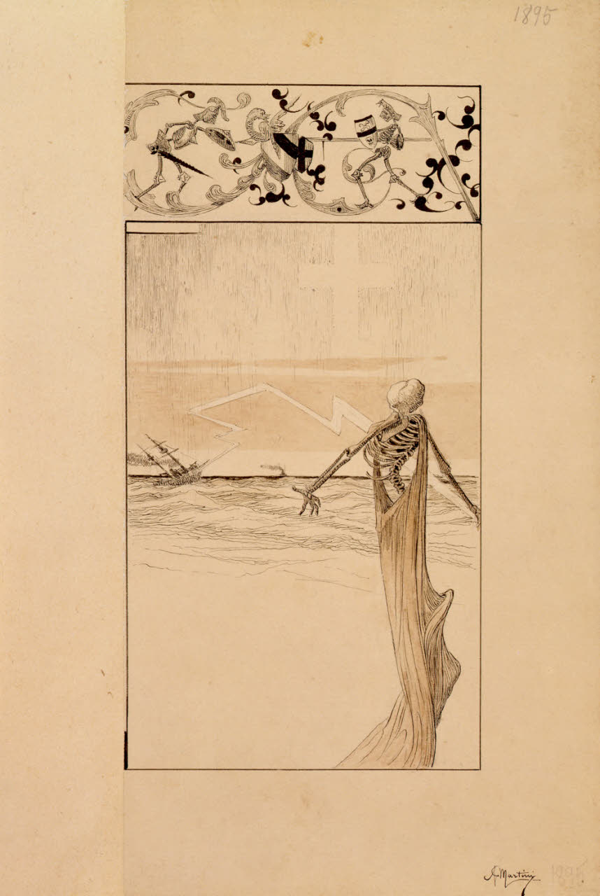- NOTIZIE STORICO CRITICHE Come ricordato da Mercedes Garberi fu grazie alla segnalazione di Emilio Bertonati che, nel 1981, le collezioni civiche del Castello Sforzesco ottennero, grazie a un acquisto presso la Galleria del Levante, i quattordici disegni a inchiostro di china e acquerello eseguiti da Alberto Martini intorno 1895, raffiguranti L'albo della morte, opere apripista della "accesa serie dei cicli senza legami con le fonti letterarie" (Garberi 1981). Questo ciclo giovanile, così come quello dei primi disegni della serie dedicata a La secchia rapita di Tassoni, dette inizio alla copiosa produzione di incisioni e illustrazioni realizzate dell'artista negli anni successivi, che ne fecero uno tra gli illustratori italiani maggiormente apprezzati in Italia e in Europa (Ivi). La serie dell'Albo della morte, appartenuta inizialmente alla vedova dell'artista Maria Petringa, venne trasferita agli eredi, e in seguito alla Galleria del Levante di Milano che li espose per la prima volta in una mostra dedicata all'autore tra il 1978 e il 1979. Nei quattordici disegni è già rintracciabile un forte legame di Martini con la cultura decadente del suo tempo a cui si associano suggestioni cinquecentesche derivanti dalla grafica di Dürer, di Luca di Leida, Graf e Grien oltre che da significativi rimandi al simbolismo nordico moderno franco-belga e tedesco. Il frontespizio, così come l'intera serie, è caratterizzato da una grafica neo-gotica che si apre con l'invocazione oraziana Pallida mors aequo pulsat pede pauperum tabernas regumque turres, anticipando verbalmente quanto raffigurato nei fogli, in cui con fermezza si assiste alla rappresentazione della morte nella sua veste più scabrosa. Chiaro nell'intero ciclo è il rimando alle donne angeliche di Previati o ad alcune opere segantiniane come "Cattive madri" o "L'angelo della vita", in cui l'eleganza delle figure femminili si scontra con la staticità della morte che rievoca, invece, i soggetti e le ambientazioni macabre di molte delle opere dell'artista belga Félicien Rops e dei tedeschi Max Klinger e Joseph Sattler.