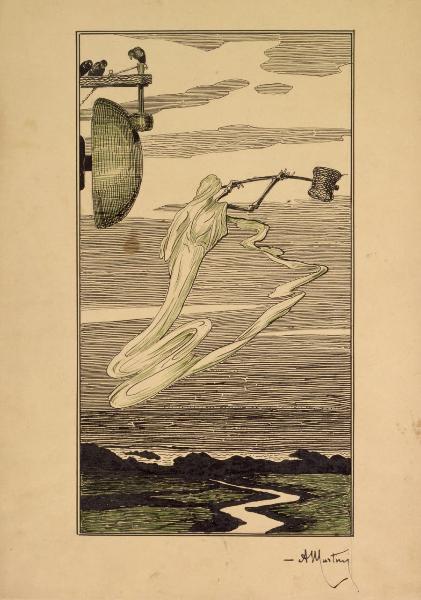- NOTIZIE STORICO CRITICHE Come ricordato da Mercedes Garberi fu grazie alla segnalazione di Emilio Bertonati che, nel 1981, le collezioni civiche del Castello Sforzesco ottennero, grazie a un acquisto presso la Galleria del Levante, i quattordici disegni a inchiostro di china e acquerello eseguiti da Alberto Martini intorno 1895, raffiguranti L'albo della morte, opere apripista della "accesa serie dei cicli senza legami con le fonti letterarie" (Garberi 1981). Questo ciclo giovanile, così come quello dei primi disegni della serie dedicata a La secchia rapita di Tassoni, dette inizio alla copiosa produzione di incisioni e illustrazioni realizzate dell'artista negli anni successivi, che ne fecero uno tra gli illustratori italiani maggiormente apprezzati in Italia e in Europa (Ivi). La serie dell'Albo della morte, appartenuta inizialmente alla vedova dell'artista Maria Petringa, venne trasferita agli eredi, e in seguito alla Galleria del Levante di Milano che li espose per la prima volta in una mostra dedicata all'autore tra il 1978 e il 1979. Nei quattordici disegni è già rintracciabile un forte legame di Martini con la cultura decadente del suo tempo a cui si associano suggestioni cinquecentesche derivanti dalla grafica di Dürer, di Luca di Leida, Graf e Grien oltre che da significativi rimandi al simbolismo nordico moderno franco-belga e tedesco. Il frontespizio, così come l'intera serie, è caratterizzato da una grafica neo-gotica che si apre con l'invocazione oraziana Pallida mors aequo pulsat pede pauperum tabernas regumque turres, anticipando verbalmente quanto raffigurato nei fogli, in cui con fermezza si assiste alla rappresentazione della morte nella sua veste più scabrosa. Chiaro nell'intero ciclo è il rimando alle donne angeliche di Previati o ad alcune opere segantiniane come "Cattive madri" o "L'angelo della vita", in cui l'eleganza delle figure femminili si scontra con la staticità della morte che rievoca, invece, i soggetti e le ambientazioni macabre di molte delle opere dell'artista belga Félicien Rops e dei tedeschi Max Klinger e Joseph Sattler.