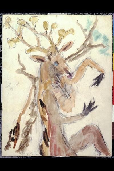 - NOTIZIE STORICO CRITICHE Il disegno fa parte di una serie di bozzetti realizzati dall'artista ferrarese in occasione della messa in scena dell'opera da camera di Vittorio Rieti "Teresa nel bosco", proposta per la prima volta nel settembre del 1934, durante il Terzo Festival Internazionale di Musica a Venezia, all'interno del teatro Goldoni. \nCon l'idea di far rivivere in forme attuali quella che è la tradizione italiana dell'intermezzo sei- settecentesco, lo spettacolo prevedeva tre opere brevi in un atto: "Teresa nel bosco" di Vittorio Rieti, "Una Favola di Anderson" di Antonio Veretti e "Cefalo e Procri" dell'austriaco Krenek con scenografie e costumi curati rispettivamente da De Pisis, Oppo e Bragaglia. \nLeggendo tra pagine di "Emporium", dove è raccontato l'evento, si evince però che il lavoro di Rieti non ebbe il successo sperato: "di Rieti noteremo soltanto la infantile puerilità dell'idea e la scarsa e ambigua inventiva adoperata per esprimerla" (Gavazzeni 1934). Dell'opera non era stata apprezzata quella combinazione tra verismo e introspezione romantica con cui veniva descritta la storia di Teresa, una donna stanca della propria vita coniugale e della mediocrità del marito; alle prese con l'alcol e i giochi di due figli capricciosi, che decide alla fine di scappare nel bosco vivendo con gli animali, fin quando un guardia caccia non la convince a tornare a casa. "Esito fu quantomai burrasco; canzonature e risate da parte della maggioranza del pubblico; qualche applauso degli amici alla fine" (Ivi). Al contrario però le scenografie di De Pisis furono apprezzate, grazie all'impressione suscitata dalla compostezza degli ambienti e dall'armonia dei colori delle scene (Pontiggia 1985). I diciotto bozzetti da datare tra il 1933 e 1934 sono oggi conservati presso il Gabinetto di Disegni del Castello Sforzesco e fecero parte della collezione di Letizia Pecci-Blunt; solo nel 1985 furono donati alle raccolte pubbliche da Gabrielli Nazareno. \nIn esse De Pisis, lontano dalle congetture architettoniche, dinamiche e luministiche vicine al futurismo, si affida prevalentemente al fondale dipinto mediante uno statico sfondo cromatico senza prospettiva che riproduce l'interno di una casa dal mobilio semplice; l'ambiente rappresentato si caratterizza per la sua sobrietà e una studiata simmetria (invv. 599, 600, 602). \nIl fondale realizzato per la scena notturna nel bosco assume connotati evanescenti (inv. 601). Qui, per eludere la lontananza prospettica De Pisis pone una serie di alberi allineati e resi attraverso pennellate guizzanti e rapidi tocchi allusivi di colore, intessuto tramite brandelli di azzurro. Le stesse pennellate sono utilizzate nei piccoli fogli da schizzo della serie dei cervi (invv. 592-594) o nei fogli più grandi, sempre con le stesse figure (invv. 586-587) le quali acquistano una sottile dimensione visionaria. \nLo stesso stile pittorico caratterizza i bozzetti realizzati per lo studio dei personaggi (Studio del servo Francesco - inv. 588; Papà Teodoro - inv. 589; Guardaboschi Luigi - inv. 590; Anna e Gianni bambini - invv. 598, 597), dove accanto a piccole pennellate di vivaci colori, sono affiancate annotazioni a matita con le caratteristiche degli indumenti e degli oggetti da indossare: guanti bianchi e scarpe nere per il figurino del Fauno del Bosco (inv. 595); sciarpa rossa con tunichetta bianca e collana di corallo per Anna o strisce azzurre nella maglia di Gianni; mentre per lo "Studio di moda per l'abito di Teresa" De Pisis crea un collage ritagliando semplicemente una rivista del periodo, da dove ricava un figurino che colora di giallo (inv. 596). Per incorniciare il tutto l'artista aveva pensato a un sipario popolato da suggestioni e simboli poetici: uno sciame di farfalle che vola verso la notte stellata. Si crea così un legame evocativo tra spettacolo e spettatore attraverso quella delicatezza degli accostamenti cromatici in una composizione fatta di semplicità e simmetria (Pontiggia 1985). Un'esperienza, quella di scenografo, che porterà De Pisis a nuove sperimentazioni; negli anni Quaranta seguiranno, infatti, gli allestimenti per "Bastiano e Bastiana" di Mozart (nel 1941 al Teatro delle Arti di Roma), il balletto per "La rosa del sogno" di Millos-Casella (all'Opera di Roma nel 1943) e infine i soli costumi per gli "Etudes Synphoniques" di Kniaseff-Shuman del 1948 (per il Ballet de Pasis) (Monti 1985).