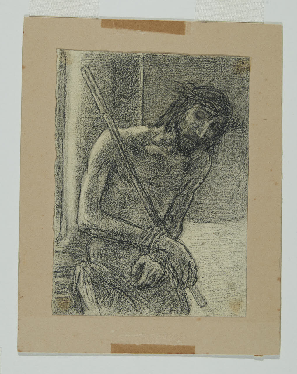 - NOTIZIE STORICO CRITICHE Della vasta produzione grafica di Gaetano Previati, si conservano all’interno del Civico Gabinetto di Disegni del Castello Sforzesco di Milano più di trecento opere su carta. Tra queste, acquistate nel 1983 dalla "Società per l’arte di Gaetano Previati" (società costituita nel 1911 con il fondo delle opere del maestro ferrarese raccolte da Grubicy), si registrano ventiquattro studi a carboncino realizzati tra l’autunno del 1901 e la primavera dell’anno successivo (inv-inv. agg. 632-655). Essi furono eseguiti dall’artista come studi preparatori per la messa in opera delle quattordici tele della "Via Crucis", oggi ai Musei Vaticani.\nSul tema della Passione di Cristo, Previati lavora a una serie di più varianti già dal 1882, quando esegue ad affresco le scene per il cimitero di Castano Primo (oggi staccati ed esposti al Museo Diocesano della città), e continua, negli anni successivi, realizzando ulteriori opere tratte dalle storie evangeliche. \nNino Barbantini, biografo di Previati, sottolinea come già dagli inizi degli anni ottanta dell’Ottocento, "le sue pitture e i suoi disegni che rappresentano i fatti della passione, formano un ciclo numeroso" e anche dopo la realizzazione degli affreschi di Castano, l’artista continua "operosissimamente a dedicare ad ogni singola stazione decine e decine di disegni [...]. Vedeva allora secondo delle composizioni tradizionali, un paese ampio, molta piccola gente, e in mezzo una piccola persona che era Gesù. Successivamente i disegni diventavano sempre più piccoli e le figure di Gesù diventavano sempre più grandi" (N. Barbantini, Gaetano Previati, Roma-Milano 1919, pp. 154-158). \nDa tale testimonianza si desumere che, seppur tra i disegni citati molteplici sono gli elementi comuni, altrettanto numerosi sono i fogli di articolata composizione spesso indipendenti dagli esiti pittorici. In alcuni esempi grafici si osservano composizioni ampie e descrittive, figure dispiegate in spazi ariosi con una sostanziale compattezza stilistica e tagli compositivi arditi. (cfr. Le opere di Gaetano Previati dell’associazione nazionale fra mutilati e invalidi di guerra, Milano 1927, tav. XXI-XXXVII; cfr. F. Bellozzi, T. Fiori, Archivi del Divisionismo, Roma 1968).\nDiverso è, invece, il caso dei ventiquattro piccoli fogli del Castello; in questi ultimi, infatti, si riscontrano chiare analogie iconografiche con le quattordici tele eseguite nei primi anni del Novecento.\nSecondo quanto sostenuto da Gianfranco Bruno, in occasione dalla loro prima esposizione nel 1983, questi fogli sono stati realizzati contemporaneamente alla serie pittorica, se non addirittura subito dopo "come piccolo ciclo destinato alla diffusione da studio". È più probabile però, vista anche la presenza di diverse varianti per alcune delle stazioni rappresentate, che i piccoli disegni abbiano accompagnato tutta la fatica di Previati per l’esecuzione delle opere, e che sia stato lo stesso Grubicy a decidere di raccogliere il meglio degli studi da taccuino, appositamente selezionati per la circolazione (Bruno 1983). \nNei ventiquattro fogli del Castello, l’artista è riuscito a comunicare un’intensità espressiva raramente raggiunta nelle sue opere pittoriche di soggetto religioso. Egli, infatti, in queste immagini raggiunge livelli di struggente e inusuale sensualità mistica. Le figure sono descritte attraverso una naturalezza degli atteggiamenti, entro i confini di uno spazio minimo e con una riduzione prospetticamente della scena che fa posto al Cristo o ai dolenti in primo piano. Inoltre, attraverso mutamenti di segno e chiaroscuro: "da un tratto violento, nervosamente sovrapposto a uno morbido e quasi dissolto in uno sfumato pulviscolare" (Fergonzi 1999), Previati riesce magistralmente a eludere i contorni e a immergere le figure in un chiaroscuro quasi trascendentale.