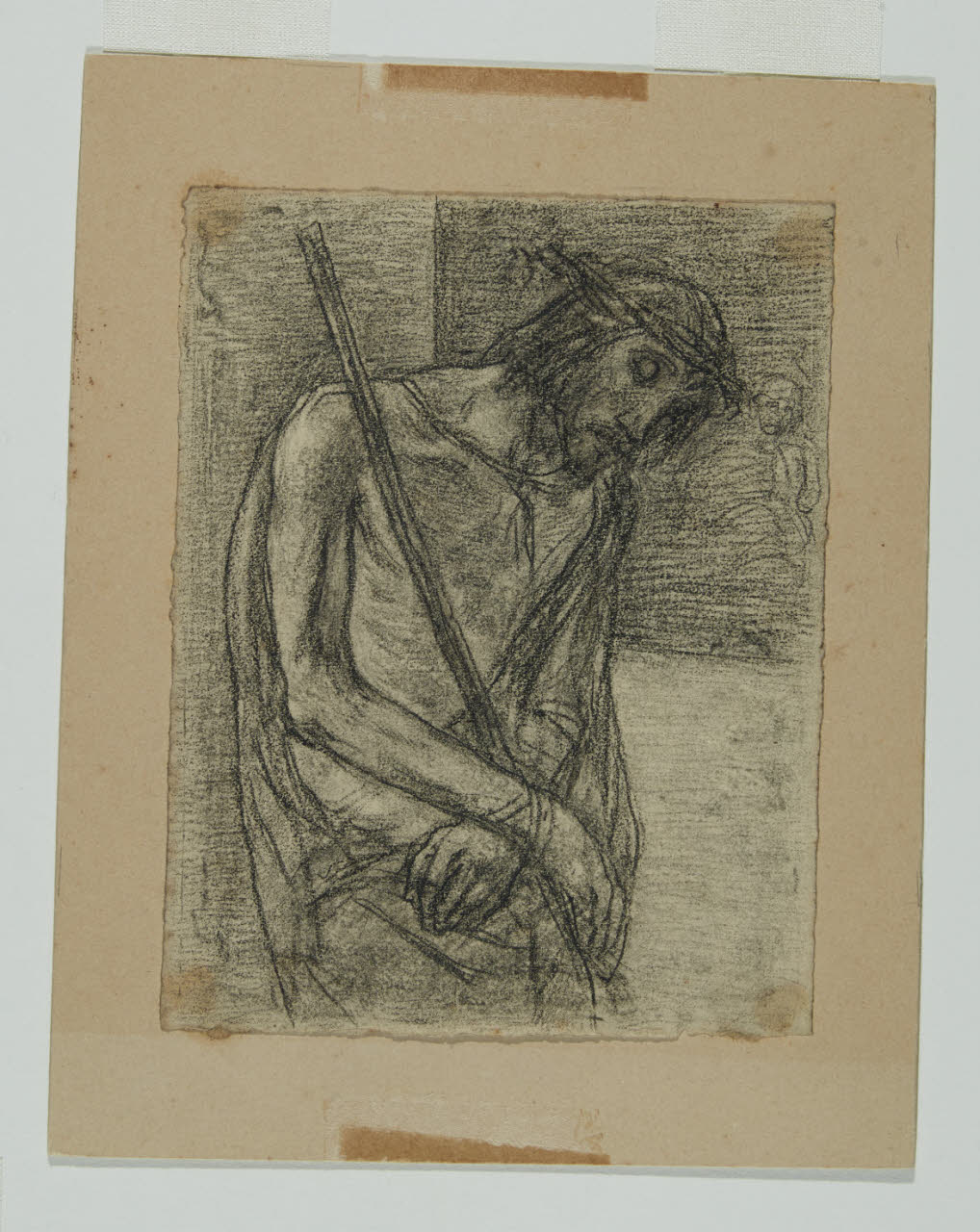 - NOTIZIE STORICO CRITICHE Della vasta produzione grafica di Gaetano Previati, si conservano all’interno del Civico Gabinetto di Disegni del Castello Sforzesco di Milano più di trecento opere su carta. Tra queste, acquistate nel 1983 dalla "Società per l’arte di Gaetano Previati" (società costituita nel 1911 con il fondo delle opere del maestro ferrarese raccolte da Grubicy), si registrano ventiquattro studi a carboncino realizzati tra l’autunno del 1901 e la primavera dell’anno successivo (inv-inv. agg. 632-655). Essi furono eseguiti dall’artista come studi preparatori per la messa in opera delle quattordici tele della "Via Crucis", oggi ai Musei Vaticani.\nSul tema della Passione di Cristo, Previati lavora a una serie di più varianti già dal 1882, quando esegue ad affresco le scene per il cimitero di Castano Primo (oggi staccati ed esposti al Museo Diocesano della città), e continua, negli anni successivi, realizzando ulteriori opere tratte dalle storie evangeliche. \nNino Barbantini, biografo di Previati, sottolinea come già dagli inizi degli anni ottanta dell’Ottocento, "le sue pitture e i suoi disegni che rappresentano i fatti della passione, formano un ciclo numeroso" e anche dopo la realizzazione degli affreschi di Castano, l’artista continua "operosissimamente a dedicare ad ogni singola stazione decine e decine di disegni [...]. Vedeva allora secondo delle composizioni tradizionali, un paese ampio, molta piccola gente, e in mezzo una piccola persona che era Gesù. Successivamente i disegni diventavano sempre più piccoli e le figure di Gesù diventavano sempre più grandi" (N. Barbantini, Gaetano Previati, Roma-Milano 1919, pp. 154-158). \nDa tale testimonianza si desumere che, seppur tra i disegni citati molteplici sono gli elementi comuni, altrettanto numerosi sono i fogli di articolata composizione spesso indipendenti dagli esiti pittorici. In alcuni esempi grafici si osservano composizioni ampie e descrittive, figure dispiegate in spazi ariosi con una sostanziale compattezza stilistica e tagli compositivi arditi. (cfr. Le opere di Gaetano Previati dell’associazione nazionale fra mutilati e invalidi di guerra, Milano 1927, tav. XXI-XXXVII; cfr. F. Bellozzi, T. Fiori, Archivi del Divisionismo, Roma 1968).\nDiverso è, invece, il caso dei ventiquattro piccoli fogli del Castello; in questi ultimi, infatti, si riscontrano chiare analogie iconografiche con le quattordici tele eseguite nei primi anni del Novecento.\nSecondo quanto sostenuto da Gianfranco Bruno, in occasione dalla loro prima esposizione nel 1983, questi fogli sono stati realizzati contemporaneamente alla serie pittorica, se non addirittura subito dopo "come piccolo ciclo destinato alla diffusione da studio". È più probabile però, vista anche la presenza di diverse varianti per alcune delle stazioni rappresentate, che i piccoli disegni abbiano accompagnato tutta la fatica di Previati per l’esecuzione delle opere, e che sia stato lo stesso Grubicy a decidere di raccogliere il meglio degli studi da taccuino, appositamente selezionati per la circolazione (Bruno 1983). \nNei ventiquattro fogli del Castello, l’artista è riuscito a comunicare un’intensità espressiva raramente raggiunta nelle sue opere pittoriche di soggetto religioso. Egli, infatti, in queste immagini raggiunge livelli di struggente e inusuale sensualità mistica. Le figure sono descritte attraverso una naturalezza degli atteggiamenti, entro i confini di uno spazio minimo e con una riduzione prospetticamente della scena che fa posto al Cristo o ai dolenti in primo piano. Inoltre, attraverso mutamenti di segno e chiaroscuro: "da un tratto violento, nervosamente sovrapposto a uno morbido e quasi dissolto in uno sfumato pulviscolare" (Fergonzi 1999), Previati riesce magistralmente a eludere i contorni e a immergere le figure in un chiaroscuro quasi trascendentale.