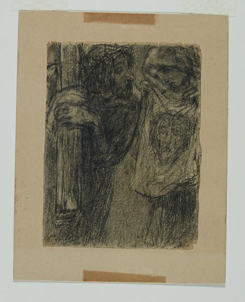 - NOTIZIE STORICO CRITICHE Della vasta produzione grafica di Gaetano Previati, si conservano all’interno del Civico Gabinetto di Disegni del Castello Sforzesco di Milano più di trecento opere su carta. Tra queste, acquistate nel 1983 dalla "Società per l’arte di Gaetano Previati" (società costituita nel 1911 con il fondo delle opere del maestro ferrarese raccolte da Grubicy), si registrano ventiquattro studi a carboncino realizzati tra l’autunno del 1901 e la primavera dell’anno successivo (inv-inv. agg. 632-655). Essi furono eseguiti dall’artista come studi preparatori per la messa in opera delle quattordici tele della "Via Crucis", oggi ai Musei Vaticani.\nSul tema della Passione di Cristo, Previati lavora a una serie di più varianti già dal 1882, quando esegue ad affresco le scene per il cimitero di Castano Primo (oggi staccati ed esposti al Museo Diocesano della città), e continua, negli anni successivi, realizzando ulteriori opere tratte dalle storie evangeliche. \nNino Barbantini, biografo di Previati, sottolinea come già dagli inizi degli anni ottanta dell’Ottocento, "le sue pitture e i suoi disegni che rappresentano i fatti della passione, formano un ciclo numeroso" e anche dopo la realizzazione degli affreschi di Castano, l’artista continua "operosissimamente a dedicare ad ogni singola stazione decine e decine di disegni [...]. Vedeva allora secondo delle composizioni tradizionali, un paese ampio, molta piccola gente, e in mezzo una piccola persona che era Gesù. Successivamente i disegni diventavano sempre più piccoli e le figure di Gesù diventavano sempre più grandi" (N. Barbantini, Gaetano Previati, Roma-Milano 1919, pp. 154-158). \nDa tale testimonianza si desumere che, seppur tra i disegni citati molteplici sono gli elementi comuni, altrettanto numerosi sono i fogli di articolata composizione spesso indipendenti dagli esiti pittorici. In alcuni esempi grafici si osservano composizioni ampie e descrittive, figure dispiegate in spazi ariosi con una sostanziale compattezza stilistica e tagli compositivi arditi. (cfr. Le opere di Gaetano Previati dell’associazione nazionale fra mutilati e invalidi di guerra, Milano 1927, tav. XXI-XXXVII; cfr. F. Bellozzi, T. Fiori, Archivi del Divisionismo, Roma 1968).\nDiverso è, invece, il caso dei ventiquattro piccoli fogli del Castello; in questi ultimi, infatti, si riscontrano chiare analogie iconografiche con le quattordici tele eseguite nei primi anni del Novecento.\nSecondo quanto sostenuto da Gianfranco Bruno, in occasione dalla loro prima esposizione nel 1983, questi fogli sono stati realizzati contemporaneamente alla serie pittorica, se non addirittura subito dopo "come piccolo ciclo destinato alla diffusione da studio". È più probabile però, vista anche la presenza di diverse varianti per alcune delle stazioni rappresentate, che i piccoli disegni abbiano accompagnato tutta la fatica di Previati per l’esecuzione delle opere, e che sia stato lo stesso Grubicy a decidere di raccogliere il meglio degli studi da taccuino, appositamente selezionati per la circolazione (Bruno 1983). \nNei ventiquattro fogli del Castello, l’artista è riuscito a comunicare un’intensità espressiva raramente raggiunta nelle sue opere pittoriche di soggetto religioso. Egli, infatti, in queste immagini raggiunge livelli di struggente e inusuale sensualità mistica. Le figure sono descritte attraverso una naturalezza degli atteggiamenti, entro i confini di uno spazio minimo e con una riduzione prospetticamente della scena che fa posto al Cristo o ai dolenti in primo piano. Inoltre, attraverso mutamenti di segno e chiaroscuro: "da un tratto violento, nervosamente sovrapposto a uno morbido e quasi dissolto in uno sfumato pulviscolare" (Fergonzi 1999), Previati riesce magistralmente a eludere i contorni e a immergere le figure in un chiaroscuro quasi trascendentale.