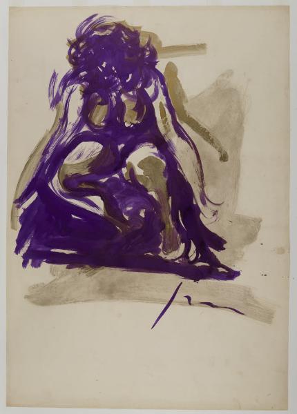 - NOTIZIE STORICO CRITICHE Tra la fine degli anni Cinquanta e la metà degli anni Sessanta del Novecento la grande produzione grafica di Lucio Fontana è dedicata in particolar modo alla rappresentazione del nudo femminile, attraverso una serie di numerose opere su carta realizzate con grossolane pennellate di colore su fogli di grandi dimensioni. Dal 1975 dopo il lascito della vedova Fontana, tre di tali opere sono conservate presso la collezione del Gabinetto dei Disegni del Castello Sforzesco (invv. 656, 657, 658). In tali fogli, così come nell'intera serie, i corpi delle donne raffigurate divengono oggetto di una nuova idea di anatomia grafica, in cui il segno si allunga agganciando il successivo in una successione di curve lievi e appena accennate (Barbero 2013, Tomo I).\nLe donne raffigurate in questi lavori, le cui forme Fontana delinea con gesto aggressivo, sono donne eleganti, sedute o sdraiate in pose sensuali, materializzate attraverso spessi tratti di colore nero a cui si sovrappongono colori sgargianti di arancio, viola, argento e oro. L'accentuata volumetria dei seni, dei glutei e delle folte capigliature, trasformano queste fanciulle in donne centauro, arpie mitologiche dall'aspetto di grandi sculture dipinte. Anche in questi esempi l'artista sembra concepire il disegno come un'occasione per fissare un'idea, tracciata con estrema immediatezza e libertà espressiva. Nella sua intera opera, ma in particolare alla fine della carriera, il suo virtuosismo risiede nella capacità di dar forma alle figure con tratti continui e schematici, attraverso un segno veloce ma descrittivo che si allontana dal modello, per creare invece un prototipo ideale e fantastico, manifestato attraverso il gesto violento delle proprie mani. \nUn'ampia raccolta di tale genere grafico dell'artista è stata pubblicata nel "Catalogo ragionato" a lui dedicato, in cui compaiono lavori afferenti a collezioni pubbliche e private (Barbero 2013, Tomo 3, in particolar modo cat. 60-64 DF 70, p. 1054).