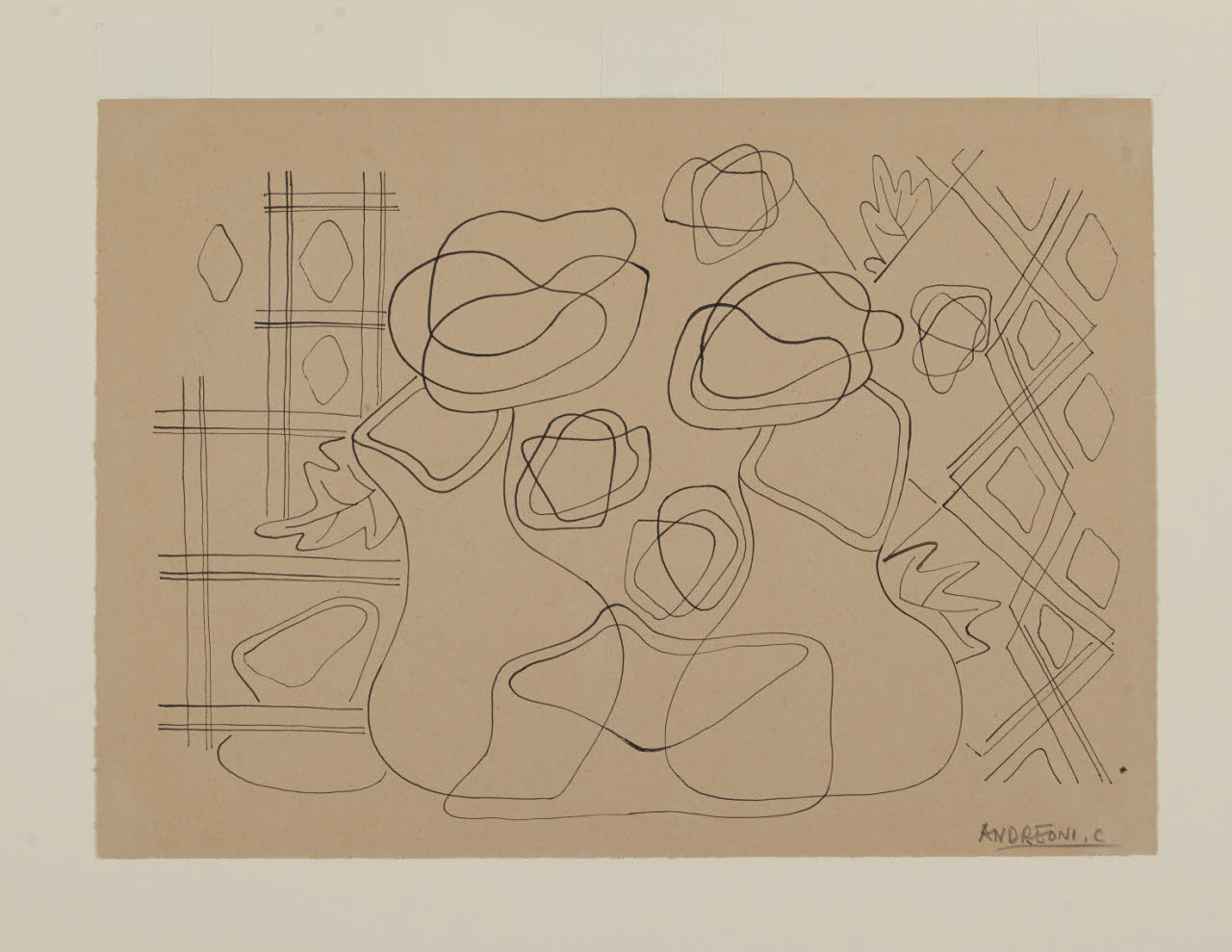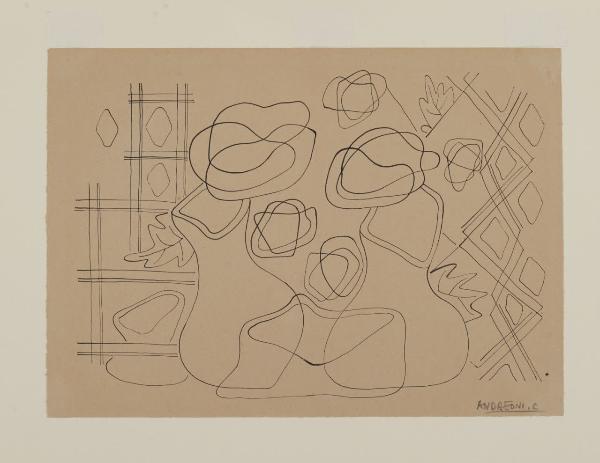 - NOTIZIE STORICO CRITICHE Osservando le opere di Cesare Andreoni, conservate presso il Civico Gabinetto di Disegni del Castello Sforzesco di Milano, si osserva uno stile non unitario, dovuto probabilmente non solo a un carattere sempre pronto a captare nuovi orientamenti, ma anche prodotto da un suo personale tormento estetico. Egli per molti anni milita tra le file dei futuristi milanesi diventando uno dei più apprezzati aeropittori. Ma rispetto al rigore quasi geometrico dei suoi primi quadri, nella produzione successiva, Andreoni lascia il posto a una visione per piani sovrapposti dove gli elementi rappresentati si infittiscono di rifermenti simbolici, di allusioni e di forme composte e astratte che si intrecciano. Nel disegno in questione l’artista, con un tratto continuo di inchiostro di china, crea una serie di elementi che si contrappongono e si deformano in una moderna natura morta. In essa si riconoscono, infatti, tralicci geometrici, vasi ondulati, foglie di vite e fiori stilizzati. L’opera documenta come l’interesse di Andreoni risenta contemporaneamente di un linguaggio cubofuturista e astratto, un linguaggio che egli indagherà durante il corso degli anni Trenta simultaneamente all’aeropittura.
