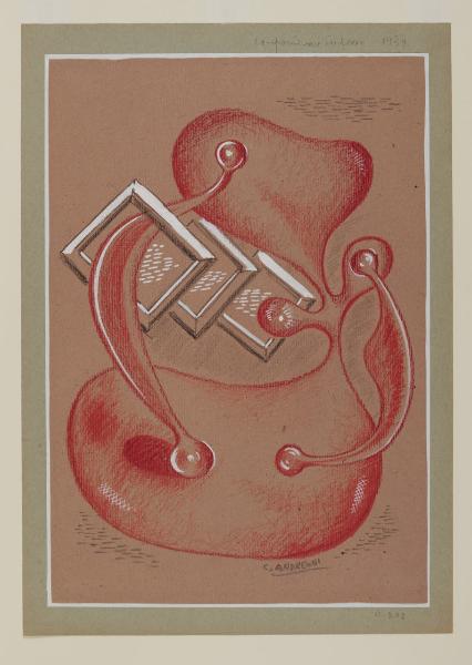 - NOTIZIE STORICO CRITICHE Dalla metà degli anni Trenta, si osserva nelle opere di Andreoni un interesse per ritmi non rettilinei, l’uso di arabeschi e forme curve dalla forte evocazione surrealista. Osservando i disegni dell’artista, conservati presso il Civico Gabinetto di Disegni del Castello Sforzesco di Milano, si nota però una maniera espressiva non unitaria dovuta probabilmente al suo carattere sempre pronto a captare nuovi orientamenti. In questo periodo Andreoni, pittore per vocazione e con una preparazione sostanzialmente da autodidatta, passa dal rigore quasi geometrico dei primi quadri a una visione simbolica di elementi espressivi e a una cromia limpida, ma meno vivace e squillante. L’opera in questione, donata come molte altre nel 1992 dall’Archivio Andreoni all’istituto milanese, gioca sulla creazione di equilibrio tra forme materiche arrotondate e forme geometriche, attraverso una sintesi armoniosa che si avvicina alla poetica informale.