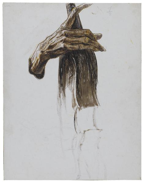 - NOTIZIE STORICO CRITICHE Benvenuto Disertori, estraneo alle avanguardie del suo tempo, sviluppa nelle sue opere uno stile sensibile e raffinato. Assimilata la cultura Liberty e decadentista del periodo, l’artista si distinse in modo particolare nella produzione di disegni e incisioni affermandosi, inoltre, come illustratore per l’editoria e come musicologo. \nNel febbraio 2015 sono stati donati al Gabinetto di Disegni del Castello Sforzesco di Milano, dal figlio Andrea, un gruppo di quattordici disegni; sono opere eseguite da Disertori tra il primo e il terzo decennio del Novecento (invv-invv. Agg. 1109 -1122) e sono tutte contrassegnate dal numero dell’album di provenienza e dal relativo numero d’ordine interno, scritto a matita sul verso di ogni foglio. Tra queste vi è lo "Studio di mano con violino", opera eseguita a penna e inchiostro bruno acquarellato, raffigurante un’esile e scarna mano che impugna delicatamente l’asta di un violino. L’opera è creata mediante tratti sottili d’inchiostro che si sovrappone a una delicata acquerellatura bruna, la quale crea un chiaroscuro intenso e marcato. Sempre nel 2015, è stato disposto in comodato per quindici anni al Civico Gabinetto, il cospicuo archivio relativo all’attività grafica di Benvenuto Disertori e della moglie Regina Philippona. Tra i disegni si regista la presenza di diverse varianti per le opere di medesimo soggetto, molte delle quali inedite e ancora tutte da studiare e quantificare. Diversi sono, infatti, gli studi con mani aguzze e spigolose che sorreggono violini o sfogliano testi, tutte opere da datare, così come "Studio di mano con violino", tra il 1907 e il 1909. Tali opere rivelano una palese volontà da parte di Disertori di richiamare nei modi e nella fisiognomica i modelli eccentrici del dandismo di Beardsley (cfr. A. Tiddia Benvenuto Disertori (1887-1967). Un segno Liberty, Milano 2012).