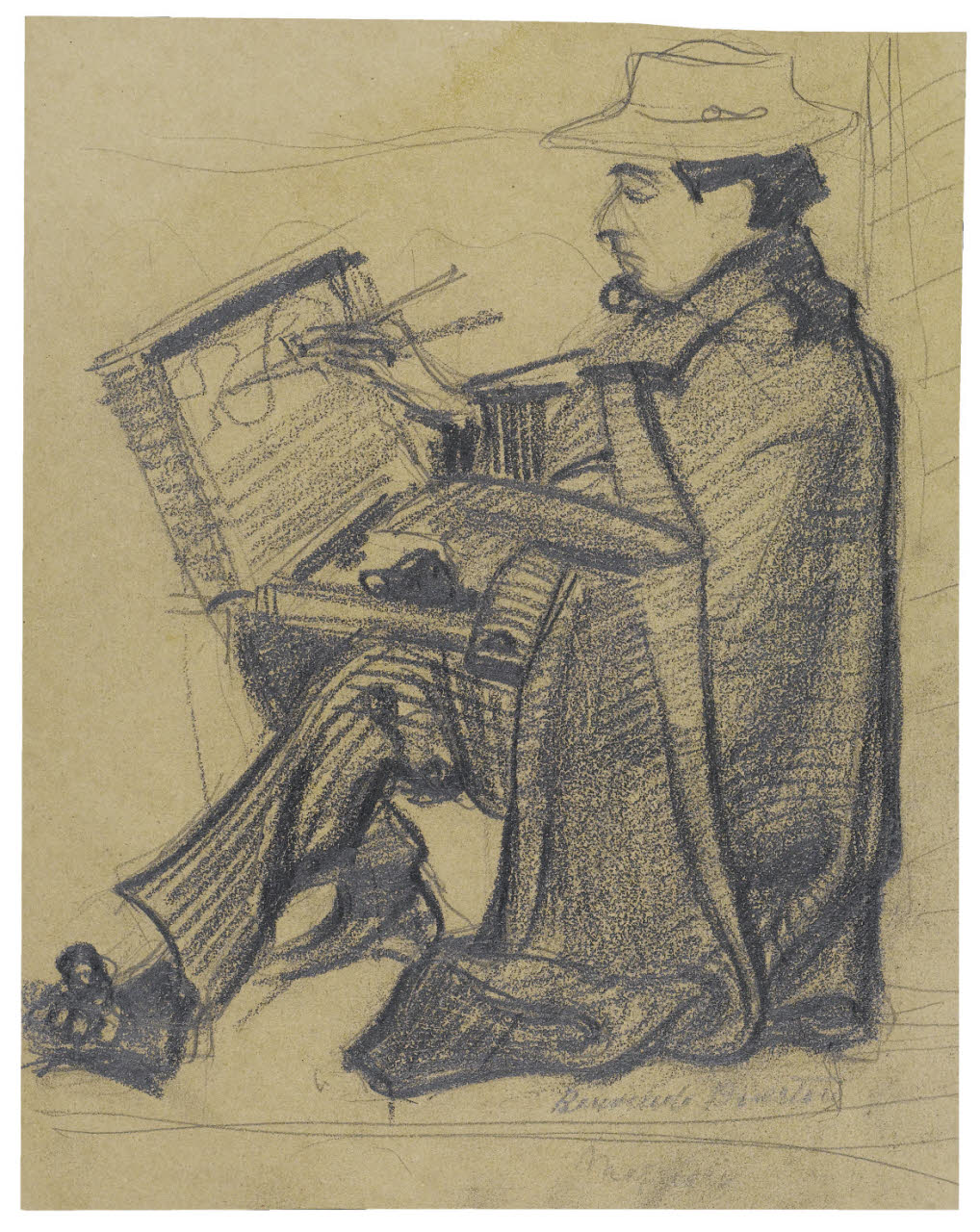 - NOTIZIE STORICO CRITICHE Tra i disegni di Benvenuto Disertori, donati al Civico Gabinetto di Disegni del Castello Sforzesco, è presente uno schizzo a carboncino raffigurante Umberto Moggioli, artista trentino, allievo con Disertori del corso di pittura tenuto da Guglielmo Cialdi all’Accademia di Venezia. La loro amicizia è testimoniata da diversi ritratti di Moggioni, eseguiti da Disertori e presenti in diverse varianti all’interno della produzione grafica dell’artista. Nel foglio in questione Umberto Moggioli è visto di profilo, seduto su un basso sgabello, abbigliato con un lungo mantello e con in testa un leggero cappello semplicemente abbozzato da una sottile linea di carboncino. Il ritrattato dipinge en plein air con la tela appoggiata al coperchio della scatola dei colori. Il disegno è realizzato su carta grigia con un tratto veloce e sgranato del carboncino che si fa più marcato e intenso nei contorni della veste e nelle zone maggiormente in ombra. Il foglio può essere considerato come un primo schizzo preparatorio per un disegno con lo stesso soggetto eseguito a china (cfr. G. Salvadori del Prato, E. Bragaglia, Benvenuto Disertori. Vedute e Ritratti, Bolzano 1995).