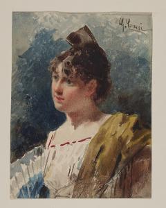 - NOTIZIE STORICO CRITICHE Il foglio ritrae una giovane donna abbigliata con eleganza vista di tre quarti. Giacomo Campi, attento e acuto ritrattista, indugia con delicatezza sul volto roseo e luminoso della donna e, con tratti rapidi di acquerello, delinea la veste bianca, la stola gialla e il vezzoso ventaglio. Occorre ricordare che il pittore fu geniale creatore di svariati tipi e personaggi, nonché collaboratore di Francesco Podesti, ultimo solenne interprete della stagione della grande "pittura di storia". Questi retaggi furono certamente ben saldi nella poetica dell’artista il quale, durante la sua prolifica attività, si dedicò instancabilmente all’invenzione di personaggi sia coevi sia, soprattutto, appartenenti a epoche precedenti. Il disegno in questione potrebbe essere uno studio preparatorio per un’opera più grande realizzata su tela.