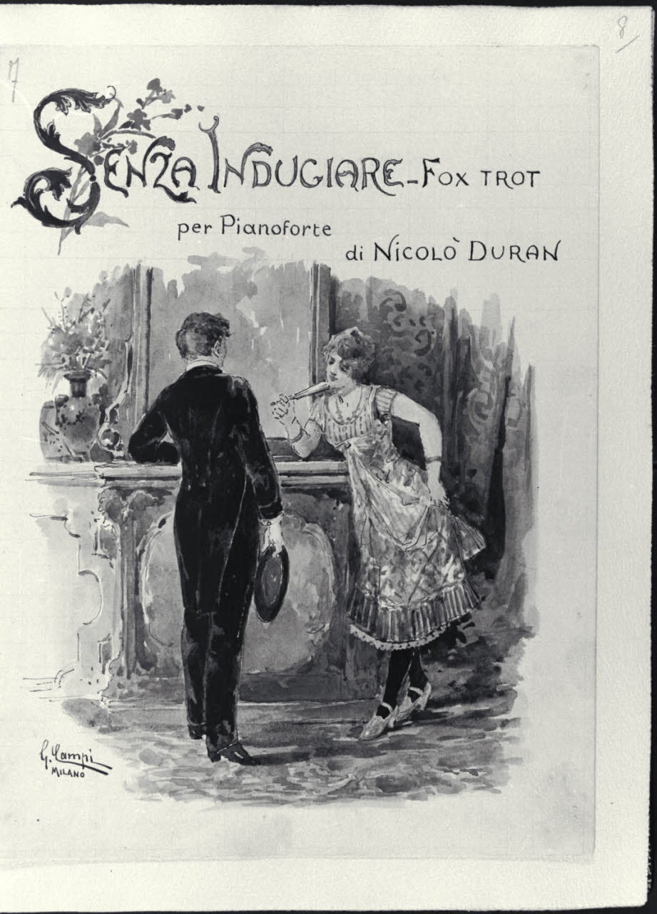- NOTIZIE STORICO CRITICHE L’album inv. L B 15 del Civico Gabinetto dei Disegni del Castello Sforzesco, raccoglie una serie di illustrazioni realizzate da Giacomo Campi (1846 - 1921). Donato al Comune di Milano da Luigi Donnini nel 1937, è composto da 61 fogli montati su 63 pagine di carta color avorio dove su ognuna di esse è indicato a matita il corrispettivo numero progressivo dei diversi fogli. I disegni, tutti firmati"Giacomo Campi. Milano", sono stati realizzati come frontespizi di spettacoli musicali, canzoni e ballate composte da Nicolò Duran; i versi di alcune di queste composizioni sono invece di U. Barbieri, E. Boccola, F. Cavallotti, G. E. Ducati, G. Giacchi, R. Paravicini, L. Stecchetti, Q. Vivanti, J. Well. Tali opere grafiche, molte delle quali quadrettate a matita, sono realizzate con rapidi e veloci tratti di inchiostro nero e acquerelli colorati dalle vivaci e cangianti cromie. Su ogni foglio, nella parte superiore al centro, campeggia il titolo della composizione descritta con caratteri stilizzati, arabeschi vegetali e capilettera figurali. Le scene rappresentate hanno spesso ambientazioni che evocano il genere musicale e rimandano a un tipico gusto Liberty, che si trasforma in motivi rococò o neoclassici. Nelle diverse composizioni si osservano principalmente soggetti e figure di giovani innamorati che danzano, si guardano o assumono atteggiamenti e pose romantiche in ambienti bucolici o all’interno di ricche dimore. Difficile risulta, a oggi, stabilire una data certa per la loro esecuzione, ma è molto probabile che siano state realizzate in un lasso di tempo abbastanza ampio e verosimilmente dopo il 1871, anno in cui l’artista prese fissa dimora a Milano. Il pittore, prima di tale data, aveva infatti frequentato l’Accademia Carrara di Bergamo e successivamente l’Accademia di S. Luca a Roma. Nella Milano di fine Ottocento acquistò subito grande popolarità, prese attivamente parte a tutte le manifestazioni della "Scapigliatura" lombarda e si distinse come pittore di affreschi, scene di genere e acquafortista, oltre che come inconfondibile acquerellista.