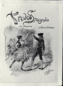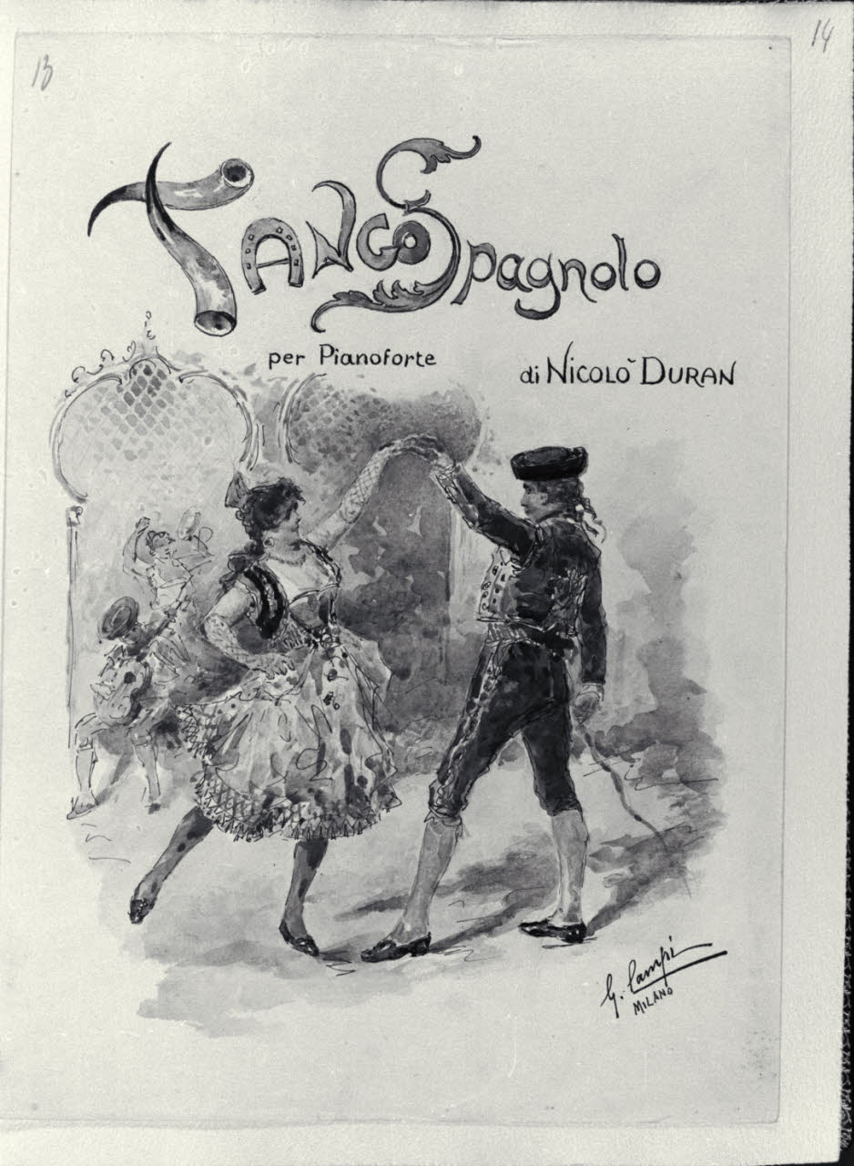 - NOTIZIE STORICO CRITICHE L’album inv. L B 15 del Civico Gabinetto dei Disegni del Castello Sforzesco, raccoglie una serie di illustrazioni realizzate da Giacomo Campi (1846 - 1921). Donato al Comune di Milano da Luigi Donnini nel 1937, è composto da 61 fogli montati su 63 pagine di carta color avorio dove su ognuna di esse è indicato a matita il corrispettivo numero progressivo dei diversi fogli. I disegni, tutti firmati"Giacomo Campi. Milano", sono stati realizzati come frontespizi di spettacoli musicali, canzoni e ballate composte da Nicolò Duran; i versi di alcune di queste composizioni sono invece di U. Barbieri, E. Boccola, F. Cavallotti, G. E. Ducati, G. Giacchi, R. Paravicini, L. Stecchetti, Q. Vivanti, J. Well. Tali opere grafiche, molte delle quali quadrettate a matita, sono realizzate con rapidi e veloci tratti di inchiostro nero e acquerelli colorati dalle vivaci e cangianti cromie. Su ogni foglio, nella parte superiore al centro, campeggia il titolo della composizione descritta con caratteri stilizzati, arabeschi vegetali e capilettera figurali. Le scene rappresentate hanno spesso ambientazioni che evocano il genere musicale e rimandano a un tipico gusto Liberty, che si trasforma in motivi rococò o neoclassici. Nelle diverse composizioni si osservano principalmente soggetti e figure di giovani innamorati che danzano, si guardano o assumono atteggiamenti e pose romantiche in ambienti bucolici o all’interno di ricche dimore. Difficile risulta, a oggi, stabilire una data certa per la loro esecuzione, ma è molto probabile che siano state realizzate in un lasso di tempo abbastanza ampio e verosimilmente dopo il 1871, anno in cui l’artista prese fissa dimora a Milano. Il pittore, prima di tale data, aveva infatti frequentato l’Accademia Carrara di Bergamo e successivamente l’Accademia di S. Luca a Roma. Nella Milano di fine Ottocento acquistò subito grande popolarità, prese attivamente parte a tutte le manifestazioni della "Scapigliatura" lombarda e si distinse come pittore di affreschi, scene di genere e acquafortista, oltre che come inconfondibile acquerellista.