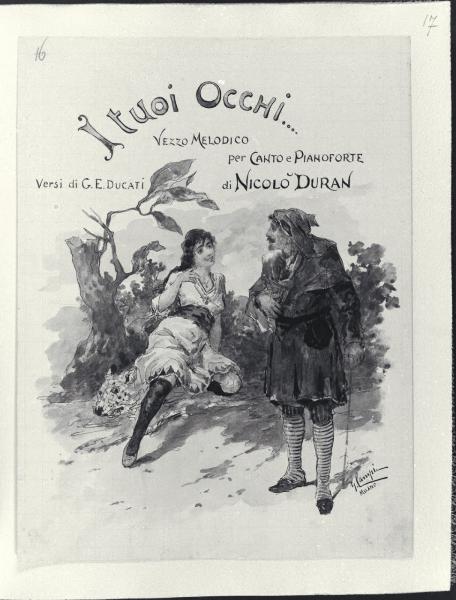 - NOTIZIE STORICO CRITICHE L’album inv. L B 15 del Civico Gabinetto dei Disegni del Castello Sforzesco, raccoglie una serie di illustrazioni realizzate da Giacomo Campi (1846 - 1921). Donato al Comune di Milano da Luigi Donnini nel 1937, è composto da 61 fogli montati su 63 pagine di carta color avorio dove su ognuna di esse è indicato a matita il corrispettivo numero progressivo dei diversi fogli. I disegni, tutti firmati"Giacomo Campi. Milano", sono stati realizzati come frontespizi di spettacoli musicali, canzoni e ballate composte da Nicolò Duran; i versi di alcune di queste composizioni sono invece di U. Barbieri, E. Boccola, F. Cavallotti, G. E. Ducati, G. Giacchi, R. Paravicini, L. Stecchetti, Q. Vivanti, J. Well. Tali opere grafiche, molte delle quali quadrettate a matita, sono realizzate con rapidi e veloci tratti di inchiostro nero e acquerelli colorati dalle vivaci e cangianti cromie. Su ogni foglio, nella parte superiore al centro, campeggia il titolo della composizione descritta con caratteri stilizzati, arabeschi vegetali e capilettera figurali. Le scene rappresentate hanno spesso ambientazioni che evocano il genere musicale e rimandano a un tipico gusto Liberty, che si trasforma in motivi rococò o neoclassici. Nelle diverse composizioni si osservano principalmente soggetti e figure di giovani innamorati che danzano, si guardano o assumono atteggiamenti e pose romantiche in ambienti bucolici o all’interno di ricche dimore. Difficile risulta, a oggi, stabilire una data certa per la loro esecuzione, ma è molto probabile che siano state realizzate in un lasso di tempo abbastanza ampio e verosimilmente dopo il 1871, anno in cui l’artista prese fissa dimora a Milano. Il pittore, prima di tale data, aveva infatti frequentato l’Accademia Carrara di Bergamo e successivamente l’Accademia di S. Luca a Roma. Nella Milano di fine Ottocento acquistò subito grande popolarità, prese attivamente parte a tutte le manifestazioni della "Scapigliatura" lombarda e si distinse come pittore di affreschi, scene di genere e acquafortista, oltre che come inconfondibile acquerellista.