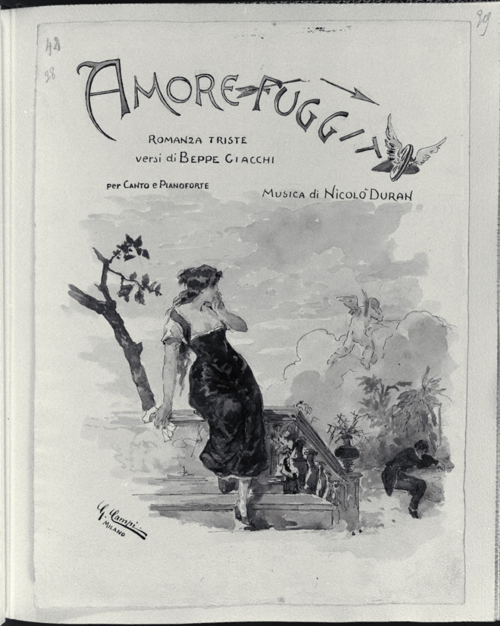 - NOTIZIE STORICO CRITICHE L’album inv. L B 15 del Civico Gabinetto dei Disegni del Castello Sforzesco, raccoglie una serie di illustrazioni realizzate da Giacomo Campi (1846 - 1921). Donato al Comune di Milano da Luigi Donnini nel 1937, è composto da 61 fogli montati su 63 pagine di carta color avorio dove su ognuna di esse è indicato a matita il corrispettivo numero progressivo dei diversi fogli. I disegni, tutti firmati"Giacomo Campi. Milano", sono stati realizzati come frontespizi di spettacoli musicali, canzoni e ballate composte da Nicolò Duran; i versi di alcune di queste composizioni sono invece di U. Barbieri, E. Boccola, F. Cavallotti, G. E. Ducati, G. Giacchi, R. Paravicini, L. Stecchetti, Q. Vivanti, J. Well. Tali opere grafiche, molte delle quali quadrettate a matita, sono realizzate con rapidi e veloci tratti di inchiostro nero e acquerelli colorati dalle vivaci e cangianti cromie. Su ogni foglio, nella parte superiore al centro, campeggia il titolo della composizione descritta con caratteri stilizzati, arabeschi vegetali e capilettera figurali. Le scene rappresentate hanno spesso ambientazioni che evocano il genere musicale e rimandano a un tipico gusto Liberty, che si trasforma in motivi rococò o neoclassici. Nelle diverse composizioni si osservano principalmente soggetti e figure di giovani innamorati che danzano, si guardano o assumono atteggiamenti e pose romantiche in ambienti bucolici o all’interno di ricche dimore. Difficile risulta, a oggi, stabilire una data certa per la loro esecuzione, ma è molto probabile che siano state realizzate in un lasso di tempo abbastanza ampio e verosimilmente dopo il 1871, anno in cui l’artista prese fissa dimora a Milano. Il pittore, prima di tale data, aveva infatti frequentato l’Accademia Carrara di Bergamo e successivamente l’Accademia di S. Luca a Roma. Nella Milano di fine Ottocento acquistò subito grande popolarità, prese attivamente parte a tutte le manifestazioni della "Scapigliatura" lombarda e si distinse come pittore di affreschi, scene di genere e acquafortista, oltre che come inconfondibile acquerellista.