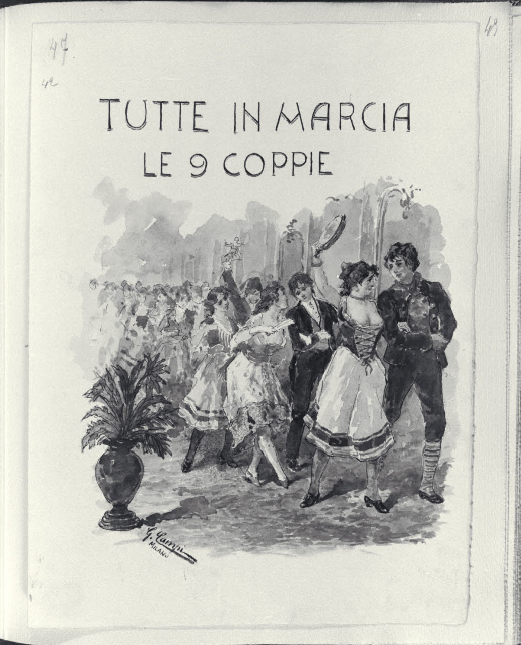 - NOTIZIE STORICO CRITICHE L’album inv. L B 15 del Civico Gabinetto dei Disegni del Castello Sforzesco, raccoglie una serie di illustrazioni realizzate da Giacomo Campi (1846 - 1921). Donato al Comune di Milano da Luigi Donnini nel 1937, è composto da 61 fogli montati su 63 pagine di carta color avorio dove su ognuna di esse è indicato a matita il corrispettivo numero progressivo dei diversi fogli. I disegni, tutti firmati"Giacomo Campi. Milano", sono stati realizzati come frontespizi di spettacoli musicali, canzoni e ballate composte da Nicolò Duran; i versi di alcune di queste composizioni sono invece di U. Barbieri, E. Boccola, F. Cavallotti, G. E. Ducati, G. Giacchi, R. Paravicini, L. Stecchetti, Q. Vivanti, J. Well. Tali opere grafiche, molte delle quali quadrettate a matita, sono realizzate con rapidi e veloci tratti di inchiostro nero e acquerelli colorati dalle vivaci e cangianti cromie. Su ogni foglio, nella parte superiore al centro, campeggia il titolo della composizione descritta con caratteri stilizzati, arabeschi vegetali e capilettera figurali. Le scene rappresentate hanno spesso ambientazioni che evocano il genere musicale e rimandano a un tipico gusto Liberty, che si trasforma in motivi rococò o neoclassici. Nelle diverse composizioni si osservano principalmente soggetti e figure di giovani innamorati che danzano, si guardano o assumono atteggiamenti e pose romantiche in ambienti bucolici o all’interno di ricche dimore. Difficile risulta, a oggi, stabilire una data certa per la loro esecuzione, ma è molto probabile che siano state realizzate in un lasso di tempo abbastanza ampio e verosimilmente dopo il 1871, anno in cui l’artista prese fissa dimora a Milano. Il pittore, prima di tale data, aveva infatti frequentato l’Accademia Carrara di Bergamo e successivamente l’Accademia di S. Luca a Roma. Nella Milano di fine Ottocento acquistò subito grande popolarità, prese attivamente parte a tutte le manifestazioni della "Scapigliatura" lombarda e si distinse come pittore di affreschi, scene di genere e acquafortista, oltre che come inconfondibile acquerellista.