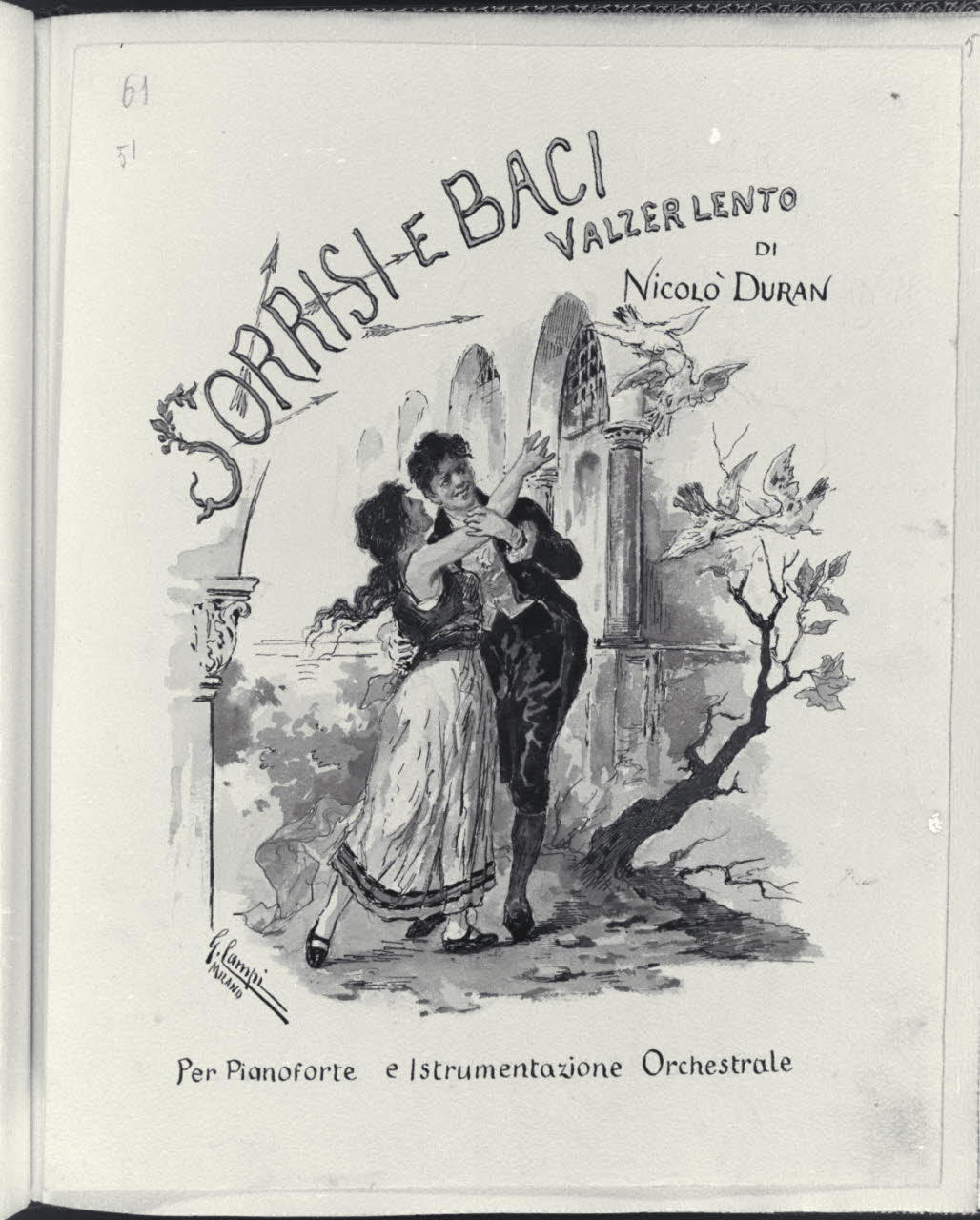 - NOTIZIE STORICO CRITICHE L’album inv. L B 15 del Civico Gabinetto dei Disegni del Castello Sforzesco, raccoglie una serie di illustrazioni realizzate da Giacomo Campi (1846 - 1921). Donato al Comune di Milano da Luigi Donnini nel 1937, è composto da 61 fogli montati su 63 pagine di carta color avorio dove su ognuna di esse è indicato a matita il corrispettivo numero progressivo dei diversi fogli. I disegni, tutti firmati"Giacomo Campi. Milano", sono stati realizzati come frontespizi di spettacoli musicali, canzoni e ballate composte da Nicolò Duran; i versi di alcune di queste composizioni sono invece di U. Barbieri, E. Boccola, F. Cavallotti, G. E. Ducati, G. Giacchi, R. Paravicini, L. Stecchetti, Q. Vivanti, J. Well. Tali opere grafiche, molte delle quali quadrettate a matita, sono realizzate con rapidi e veloci tratti di inchiostro nero e acquerelli colorati dalle vivaci e cangianti cromie. Su ogni foglio, nella parte superiore al centro, campeggia il titolo della composizione descritta con caratteri stilizzati, arabeschi vegetali e capilettera figurali. Le scene rappresentate hanno spesso ambientazioni che evocano il genere musicale e rimandano a un tipico gusto Liberty, che si trasforma in motivi rococò o neoclassici. Nelle diverse composizioni si osservano principalmente soggetti e figure di giovani innamorati che danzano, si guardano o assumono atteggiamenti e pose romantiche in ambienti bucolici o all’interno di ricche dimore. Difficile risulta, a oggi, stabilire una data certa per la loro esecuzione, ma è molto probabile che siano state realizzate in un lasso di tempo abbastanza ampio e verosimilmente dopo il 1871, anno in cui l’artista prese fissa dimora a Milano. Il pittore, prima di tale data, aveva infatti frequentato l’Accademia Carrara di Bergamo e successivamente l’Accademia di S. Luca a Roma. Nella Milano di fine Ottocento acquistò subito grande popolarità, prese attivamente parte a tutte le manifestazioni della "Scapigliatura" lombarda e si distinse come pittore di affreschi, scene di genere e acquafortista, oltre che come inconfondibile acquerellista.