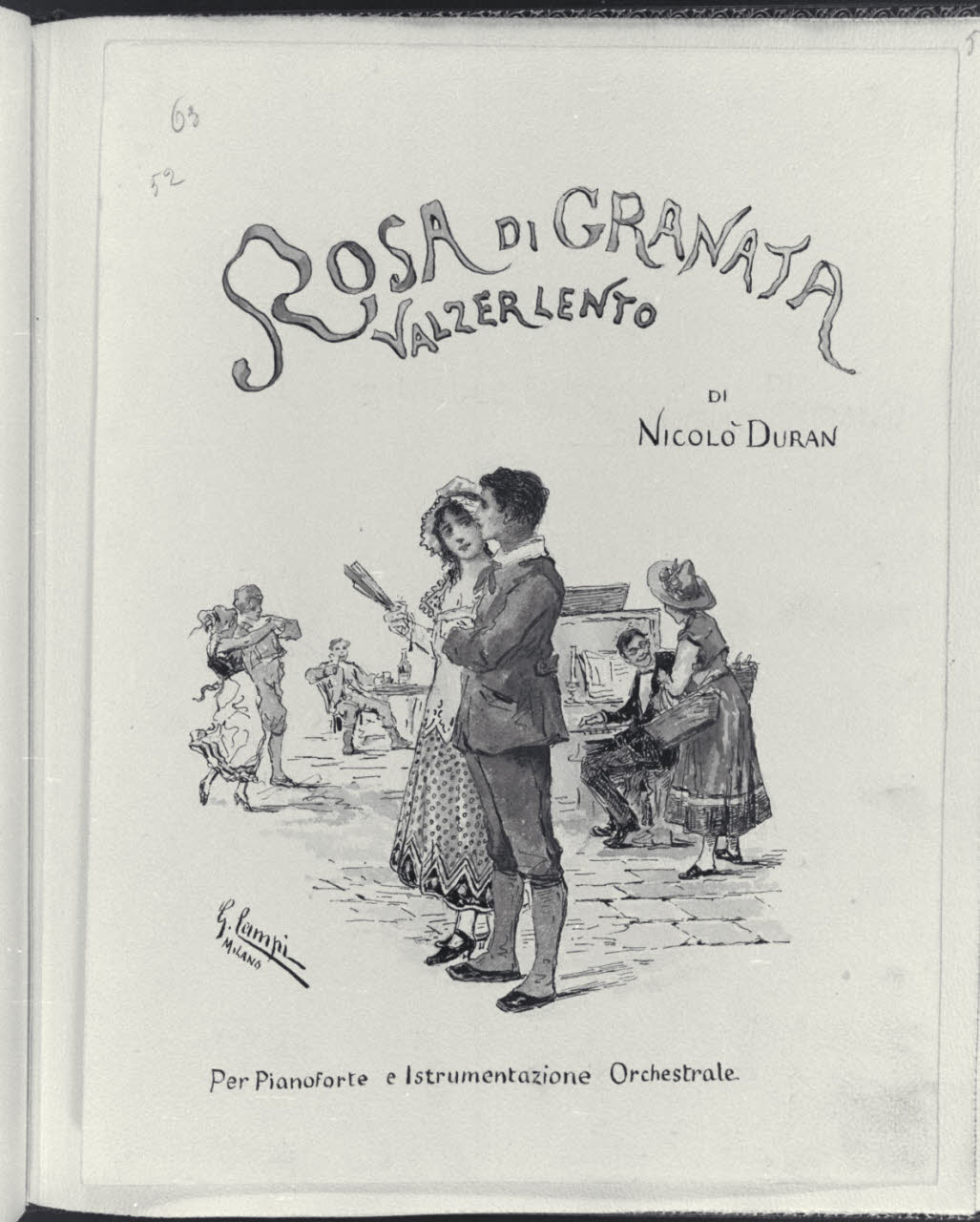 - NOTIZIE STORICO CRITICHE L’album inv. L B 15 del Civico Gabinetto dei Disegni del Castello Sforzesco, raccoglie una serie di illustrazioni realizzate da Giacomo Campi (1846 - 1921). Donato al Comune di Milano da Luigi Donnini nel 1937, è composto da 61 fogli montati su 63 pagine di carta color avorio dove su ognuna di esse è indicato a matita il corrispettivo numero progressivo dei diversi fogli. I disegni, tutti firmati"Giacomo Campi. Milano", sono stati realizzati come frontespizi di spettacoli musicali, canzoni e ballate composte da Nicolò Duran; i versi di alcune di queste composizioni sono invece di U. Barbieri, E. Boccola, F. Cavallotti, G. E. Ducati, G. Giacchi, R. Paravicini, L. Stecchetti, Q. Vivanti, J. Well. Tali opere grafiche, molte delle quali quadrettate a matita, sono realizzate con rapidi e veloci tratti di inchiostro nero e acquerelli colorati dalle vivaci e cangianti cromie. Su ogni foglio, nella parte superiore al centro, campeggia il titolo della composizione descritta con caratteri stilizzati, arabeschi vegetali e capilettera figurali. Le scene rappresentate hanno spesso ambientazioni che evocano il genere musicale e rimandano a un tipico gusto Liberty, che si trasforma in motivi rococò o neoclassici. Nelle diverse composizioni si osservano principalmente soggetti e figure di giovani innamorati che danzano, si guardano o assumono atteggiamenti e pose romantiche in ambienti bucolici o all’interno di ricche dimore. Difficile risulta, a oggi, stabilire una data certa per la loro esecuzione, ma è molto probabile che siano state realizzate in un lasso di tempo abbastanza ampio e verosimilmente dopo il 1871, anno in cui l’artista prese fissa dimora a Milano. Il pittore, prima di tale data, aveva infatti frequentato l’Accademia Carrara di Bergamo e successivamente l’Accademia di S. Luca a Roma. Nella Milano di fine Ottocento acquistò subito grande popolarità, prese attivamente parte a tutte le manifestazioni della "Scapigliatura" lombarda e si distinse come pittore di affreschi, scene di genere e acquafortista, oltre che come inconfondibile acquerellista.