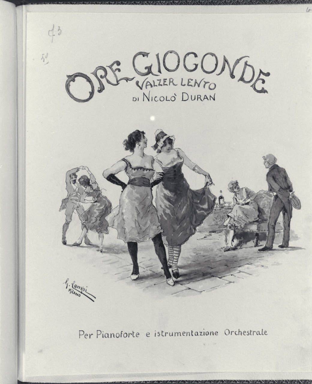 - NOTIZIE STORICO CRITICHE L’album inv. L B 15 del Civico Gabinetto dei Disegni del Castello Sforzesco, raccoglie una serie di illustrazioni realizzate da Giacomo Campi (1846 - 1921). Donato al Comune di Milano da Luigi Donnini nel 1937, è composto da 61 fogli montati su 63 pagine di carta color avorio dove su ognuna di esse è indicato a matita il corrispettivo numero progressivo dei diversi fogli. I disegni, tutti firmati"Giacomo Campi. Milano", sono stati realizzati come frontespizi di spettacoli musicali, canzoni e ballate composte da Nicolò Duran; i versi di alcune di queste composizioni sono invece di U. Barbieri, E. Boccola, F. Cavallotti, G. E. Ducati, G. Giacchi, R. Paravicini, L. Stecchetti, Q. Vivanti, J. Well. Tali opere grafiche, molte delle quali quadrettate a matita, sono realizzate con rapidi e veloci tratti di inchiostro nero e acquerelli colorati dalle vivaci e cangianti cromie. Su ogni foglio, nella parte superiore al centro, campeggia il titolo della composizione descritta con caratteri stilizzati, arabeschi vegetali e capilettera figurali. Le scene rappresentate hanno spesso ambientazioni che evocano il genere musicale e rimandano a un tipico gusto Liberty, che si trasforma in motivi rococò o neoclassici. Nelle diverse composizioni si osservano principalmente soggetti e figure di giovani innamorati che danzano, si guardano o assumono atteggiamenti e pose romantiche in ambienti bucolici o all’interno di ricche dimore. Difficile risulta, a oggi, stabilire una data certa per la loro esecuzione, ma è molto probabile che siano state realizzate in un lasso di tempo abbastanza ampio e verosimilmente dopo il 1871, anno in cui l’artista prese fissa dimora a Milano. Il pittore, prima di tale data, aveva infatti frequentato l’Accademia Carrara di Bergamo e successivamente l’Accademia di S. Luca a Roma. Nella Milano di fine Ottocento acquistò subito grande popolarità, prese attivamente parte a tutte le manifestazioni della "Scapigliatura" lombarda e si distinse come pittore di affreschi, scene di genere e acquafortista, oltre che come inconfondibile acquerellista.