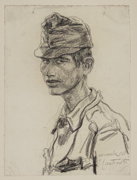 - NOTIZIE STORICO CRITICHE Studente di pittura all’Accademia di Brera, nel 1895 Innocente Cantinotti si iscrisse alla Famiglia Artistica partecipando attivamente alle esposizioni organizzate dall’Associazione. Allo scoppio della Prima Guerra Mondiale, dopo un breve corso da ufficiale, l’artista partì per il fronte come panoramista con il compito di registrare, attraverso la sua matita, l’andamento della linea nemica. Nel corso della guerra realizzò, su semplici fogli d’album, una serie di opere grafiche di grande spessore emotivo, raffiguranti paesaggi, rovine e ritratti di soldati al fronte osservati da diversi punti di vista (Marra 2008). Molte di queste testimonianze si conservano oggi all’interno delle Civiche Raccolte Storiche del comune di Milano, mentre un piccolo nucleo di ritratti con i "Prigionieri austriaci" è custodito presso il Civico Gabinetto di Disegni del Castello Sforzesco. Quest’ultimi fogli furono acquistati nel giugno del 1925 alla "Mostra degli artisti combattenti" ; una delle tante esposizioni del Gruppo degli Artisti Combattenti di cui Cantinotti fu socio fin dalla fondazione, avvenuta il 23 novembre del 1924 presso la Famiglia Artistica (Ivi.). I quattro disegni (Invv. 1573 B 556, 1574 B 557, 1576 B 559, 1576 B 559), realizzati probabilmente sul fronte del Piave - dove nel novembre del 1918 l’artista si trovava con l’ottava armata - descrivono, attraverso una restituzione meticolosa dei dettagli fisiognomici, quattro prigionieri austriaci di età differente. Sono opere dalla forte introspezione psicologica, prive di particolare ricercatezza formale, ma fortemente realistiche ed espressive. L’artista, infatti, senza nessuna retorica e attraverso un uso sapiente del chiaroscuro, dedica particolare attenzione agli stati d’animo degli effigiati, ai loro sguardi penetranti e ai volti scavati dalla sofferenza e dalla fame. Nella produzione grafica di Cantinotti tali opere mostrano una predilezione per il genere del ritratto e riescono a descrivere, "meglio ancora delle loro gesta[...], l’anima esegrabile dei nostri nemici" (cfr. Pittori Soldato al fronte, in "L’illustrazione italiana", a. XLVI n. 1, 1919, pp. 9-13).