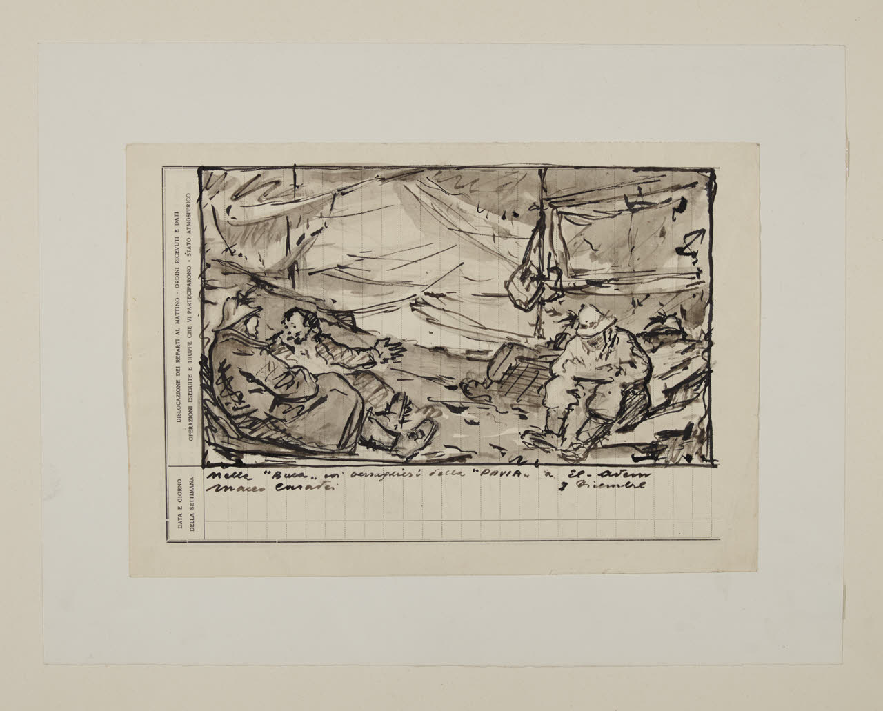 - NOTIZIE STORICO CRITICHE Quando nel 1940 l'Italia entrò in guerra a fianco della Germania, Maceo Casadei partì come volontario con il "reparto guerra", in qualità di pittore e fotoreporter per l'Istituto Nazionale Luce, con l'obbiettivo di documentare le operazioni belliche delle truppe italiane. Nelle sue memorie, scritte tra il 1950 e il 1960, l'artista forlivese racconta dettagliatamente tutti i momenti del conflitto a cui prese parte e offre un minuzioso resoconto della sua attività e dei suoi spostamenti. Delle sue esperienze si ha testimonianza nelle circa seimila fotografie scattate e nelle oltre quattrocento "impressioni" realizzate in dipinti e disegni. \nDopo alcune missioni nei mari italiani, e avendo girovagato in largo e in lungo per la penisola, nell'ottobre del 1941 Maceo si sposta in Africa settentrionale. Cosi scrive: "mi venne il desiderio di recarmi sui fronti in terra Africana, sicuro di poter raccogliere un maggior materiale di guerra, ed un diverso 'color locale' […] Dopo Tripoli, El Adem e Tobruk, ci dirigemmo a Bir-El-Gobi per riprendere le ultime fasi di una crudele battaglia" (A. Imbellone, Maceo: anni Romani, 1934-1944, Cinisello Balsamo 2008, p. 34). Nella primavera del 1942, dopo il passaggio da Dumini e Tauorga, Maceo chiese e ottenne il permesso di far ritorno a Roma, e tra il maggio e il giugno dello stesso anno allestisce alle Terme di Roma la sua prima personale di guerra, presentando una quarantina di opere. \nDal 30 settembre al 12 ottobre del 1942, invece, la Galleria milanese del Milione ospitò la seconda mostra di guerra di Maceo, questa volta formata da soli disegni e guazzi, per un totale di trentadue fogli. Nel testo introduttivo alla mostra, firmato da Attilio Crespi, il critico sottolinea l'altissima capacità raggiunta dall'artista forlivese a far luce e inquadrare le scene, raccogliendo gesti e atteggiamenti attraverso una schietta emotività. Lo stesso Maceo ricorda nelle sue memorie manoscritte, il grande successo di critica e di pubblico ottenuto dalla mostra e la triste chiusura a causa del primo bombardamento aereo su Milano.\nDi questi disegni, secondo le parole dell'artista, ventotto furono venduti: otto acquistati da privati, cinque dal Museo del Rinascimento di Milano e la rimanenza dal comune del capoluogo lombardo e destinati alle Raccolte Bertarelli. A questi quindici fogli, oggi conservati all'interno del Civico Gabinetto di Disegni (invv. 1949/1 C 202/1 - 1949/15 C202/15), si è aggiunto un altro nucleo donato dal pittore intorno agli inizi degli anni Sessanta. Essi comprendono alcune opere eseguite come le precedenti durante la campagna in Africa (invv. Agg. 239; 70; 228; 229; 234;), e altri disegni datati al 1918, al 1943 e al 1944 (invv. Agg. 68-71; 228-238).\nI disegni di guerra di Maceo Casadei realizzati tra il 1941 e il 1942 si distaccano, nella maggior parte dei casi, dal tipico filone documentario per un carattere di sintetica immediatezza e vibrazione lirica del colore. Il mutare rapido della scena costringe l'artista a immortalare il gemito della raffigurazione tramite tratti veloci di inchiostro di china e linee spezzate in supporti cartacei, alcuni dei quali di fortuna: pagine di protocollo stampato, fogli di taccuino o di diario. Così scrisse "fotografo e disegno scarabocchiando fogli su fogli di carta d'ogni tipo e colore" (Ivi.).\nAttraverso il filtro del suo sguardo Maceo concentra il dramma della guerra in una rappresentazione piena di dinamicità, dove il dolore non è raffigurato attraverso le figure, che risultano schematiche e abbozzate, ma in una resa violenta del conflitto armato. Attraverso un tratto veloce e schizzato con variazioni delicate di colore diluito, la guerra è tratteggiata in lontananza con i soldati in corteo tra le sterminate dune del deserto o all'interno di buche scavate nella terra; tra i mari in mezzo agli scontri navali o nei campi di battaglia tra i carri armati. Oltre a ciò Casadei realizza alcuni splendidi paesaggi di deserto inserendo in alcuni casi non solo i cortei delle truppe militari, ma anche piccole figurine schizzate o accampamenti di beduini. Inoltre, con l'intento di offrire il ricordo di quei terribili ma avventurosi momenti, ogni foglio è contraddistinto, oltre che da data e firma, dalla presenza di note autografe con il quale l'artista regista le vicende che raffigura.