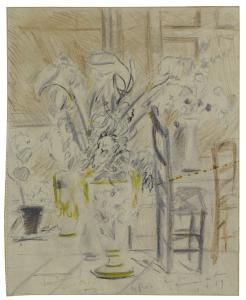 - NOTIZIE STORICO CRITICHE Nel 1929 a Parigi De Pisis prende possesso del suo studio in Rue Servandoni 7, situato nel quartiere Saint Germain des Prés. Il disegno datato al maggio dello stesso anno appartiene al periodo francese e, così come testimoniato dall'iscrizione autografa, fu eseguito nel suddetto quartiere parigino. Acquistato per le raccolte pubbliche nel gennaio del 1931 dalla Galleria Milano, è probabile che il foglio sia stato esposto, con il titolo di "Fiori", alla Prima Mostra di pittori italiani residenti a Parigi organizzata dalla galleria milanese nel gennaio dello stesso anno, dove De Pisis presenta una serie di opere insieme a Campigli, De Chirico, Paresce, Savino, Severini e Tozzi. \nIl tema dei fiori, molto caro a De Pisis, è stato sviluppato in numerosissime varianti con le più diverse tecniche espressive. Tale genere, infatti, è presente all'interno delle sue opere già in età giovanile quando, interessatosi alla botanica, inizia a catalogare i diversi tipi di piante. La Natura morta, oggi conservata presso le raccolte del Gabinetto di Disegni del Castello Sforzesco, è contrassegnata da tocchi rapidi e allusivi di matita e pastelli colorati. Quello che l'artista raffigura è l'interno di una stanza popolata da oggetti; oltre a due sedie e diverse piante, poste su un pavimento in prospettiva, al centro della scena campeggia un meraviglioso vaso smaltato dal quale fuoriesce un grande mazzo di fiori primaverili con calle, fili d'erba e boccioli di campo. Qui l'occhio sembra non potersi soffermare su un solo elemento, attratto dalla vivacità cromatica dei pastelli e dalla velocità dei tratti di matita. Più che concentrarsi sul particolare realistico, infatti, la visione si frantuma in immagini rapide, in cui si manifesta la fragile delicatezza del mazzo fiorito, omaggio alla bellezza del creato e alla vita che sfugge.