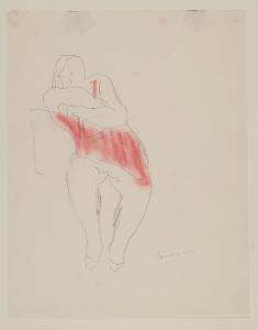 - NOTIZIE STORICO CRITICHE Arrivato dall'Argentina nel 1927, Lucio Fontana entra subito in contatto con il mondo artistico e culturale del capoluogo lombardo grazie ai legami creati con la galleria milanese del Milione. Grazie questa collaborazione si fa conoscere da un vasto pubblico, attraverso una serie di mostre personali e collettive, nelle quali espone delle opere di carattere ancora giovanile, ma di grande modernità espressiva. Nel marzo del 1932, probabilmente dopo la mostra allestita nel dicembre del 1931 in Libreria (Vilardi 2001-2002), l'allora soprintendente Giorno Nicodemi acquista due disegni dell'artista per le raccolte pubbliche, il primo con uno "Schizzo di due figure femminili" (B 948) e il secondo con uno "Studio di figura femminile" (B 949). Tale vicenda è documentata da un atto del 2 gennaio del 1932 che recita: "Alla Galleria del Milione [...] è stata fatta di recente una esposizione delle opere dello scultore Lucio Fontana artista assai noto nel campo dell'avanguardia e che questa esposizione ha contribuito a mettere viepiù in valore. Siccome l'artista non è ancora rappresentato nelle raccolte dei disegni della quale si sta redigendo il catalogo" se ne propone l'acquisizione all'interno di tali raccolte (Garberi 1991). I due fogli della Galleria del Milione, così come quelli acquistati l'anno successivo direttamente d'all'artista (invv. B 950, B 951, B 952), mostrano un mutamento espressivo che si distacca nettamente dal gusto classicista del gruppo del Novecento italiano e anticipa le innovazioni poetiche presenti nelle sue successive opere. Entrambi i fogli, del 1932, sono delineati con un tratto sottile della penna al quale è stato sovrapposto, attraverso un segno morbido e sfumato del colore, come se fosse un acquerello, del pastello; azzurro nelle due figure e rosso nella figura singola. Le fisionomie sono descritte attraverso veloci tratti stilizzati e linee nette e spezzate. Inoltre, così come ricordato da Elena Vilardi nei fogli in questione la rappresentazione figurativa della composizione si avvicina al grafismo surrealista delle opere di Archipenko e Zadkine, interpretati da Fontana come elementi di sperimentazione che lo allontanano ancora di più dai movimenti artistici allora in voga in Italia (Vilardi 2001-2002). Tali fogli si possono confrontare con la serie di disegni pubblicati da Luca Massimo Barbero sul "Catalogo ragionato delle opere su carta" di Lucio Fontana (in particolar modo ai numeri di catalogo 32 DF 42, 32 DF 43 per "Schizzo di due figure femminili" e 32 DF 41, 32 DF 45 per lo "Studio di figura") (Barbero 2013, Tomo 1).