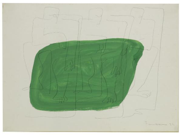 - NOTIZIE STORICO CRITICHE Dopo aver acquistato due disegni di Lucio Fontana (B 948, B 949) presso la galleria del Milione nel 1932, l'allora soprintendente Giorgio Nicodemi nel 1934 incrementa la collezione di grafica del Castello Sforzesco con altre tre opere dell'artista argentino, tra cui il foglio con una Composizione di figure. Tale opera si caratterizza, nella sterminata attività giovanile dell'artista, per una peculiare sintesi compositiva tra elementi figurativi e astratti che portano Fontana ad allontanarsi dalle correnti allora in voga in Italia e sperimentare, invece, un'arte autonoma e originale. Nel disegno sono rappresentati, attraverso un sottile segno grafico, tre monumentali esseri che ritroviamo oltre che nelle opere grafiche, anche nelle sculture del periodo. Entità primordiali che si generano sul foglio, così come in scultura, assumendo sembianze di gigantesche figure maschili. Su queste si materializza una macchia monocroma di verde che lascia intravedere la traccia con cui sono delineate le figure. \nSeppur guardando alle opere di scultori come Zadkine e Archipenko, l'artista svilupperà in questi anni giovanili una propria autonomia di linguaggio, tanto da essere considerato già dai primi anni Trenta uno tra i più importanti protagonisti dell'arte contemporanea. Il disegno può essere comparato con diversi fogli presentati all'interno del "Catalogo ragionato delle opere su carta" dell'artista (Barbero 2013, Tomo I).