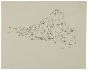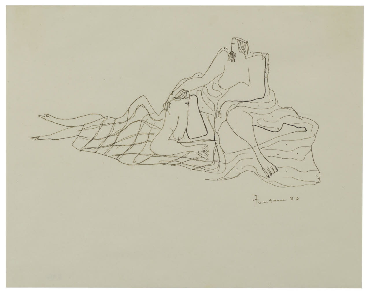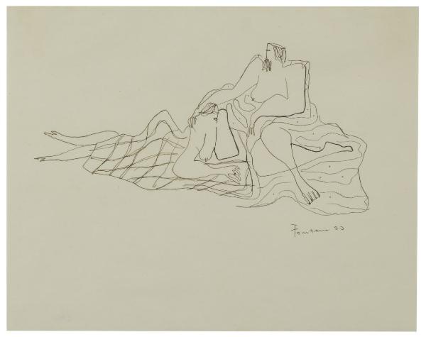 - NOTIZIE STORICO CRITICHE Tra gli artisti più operosi che frequentano gli ambienti culturali milanesi verso la metà degli anni Trenta un posto di rilievo è sicuramente occupato da Lucio Fontana, il quale opponendosi alla visione strettamente figurativa e classicista del gruppo del Novecento, dà vita a una nuova concezione della realtà attraverso opere di straordinaria unicità. Egli, infatti, allontanandosi dal concetto tradizionale di disegno, presenta una visione spaziale nuova che scaturisce da un differente dialogo tra la superficie bianca del foglio e i graffiti che vi si adagiano. Nelle figure degli "Amanti", i tratti che delineano le forme si fanno vibranti e instabili. I volumi delle figure si smaterializzano e sembrano sciogliersi, creando una composizione di figure allungate e definite da un vibrante segno continuo. Anche in questo caso, così come nelle altre opere che contraddistinguono questo periodo, Fontane va alla ricerca di una nuova sintesi figurativa, combinando gesti veloci e figure spezzate, presentate attraverso un processo di materializzazione delle forme. Il foglio fu acquistato per le collezioni pubbliche nel 1934 direttamente dall'autore insieme ad altre due opere dell'artista (invv. B 950, B 952).