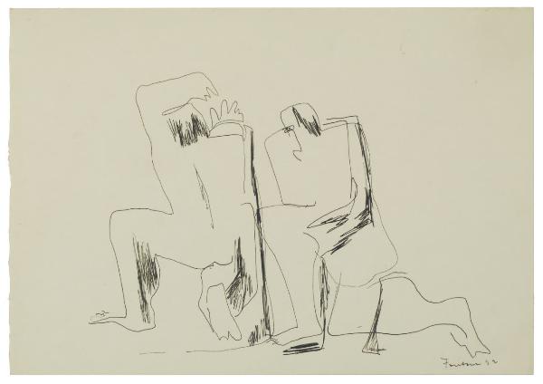 - NOTIZIE STORICO CRITICHE L'inizio degli anni Trenta costituisce per Lucio Fontana un momento di fondamentale importanza per il suo ingresso nel mondo dell'arte europea. Da questo momento, infatti, l'artista inizia la ricerca di un linguaggio nuovo, che si sviluppa attraverso la congiunzione tra elementi figurativi e astratti. "Insofferente di ogni regola artistica precostruita, egli muove fin dall'inizio del suo operare all'interno di un discorso tutto personale, pronto a spaziare dal figurativo al non-figurativo e caratterizzato dalla più ampia libertà inventiva e sperimentale" (Anzani 1993). Le "Due figure" del Gabinetto dei Disegni del Castello Sforzesco, i cui volumi sembrano riprendere le figure dei ciclopi monumentali presenti in "Composizione" (B 950) si assottigliano, lasciando posto a forme più slanciate, snellite dalla loro dilatazione fisica che si estende a tutto il foglio. Sono esseri più morbidi e leggeri, legati tra loro attraverso linee spezzate che si sovrappongono. Fontana opera sui volumi di quest'ultime mediante l'utilizzo di un segno grafico tracciato in maniera concitata, e zone d'ombra di forte contrasto. Il foglio fu acquistato per le collezioni pubbliche nel 1934 direttamente all'autore insieme ad altre due opere dell'artista (invv. B 950, B 951).